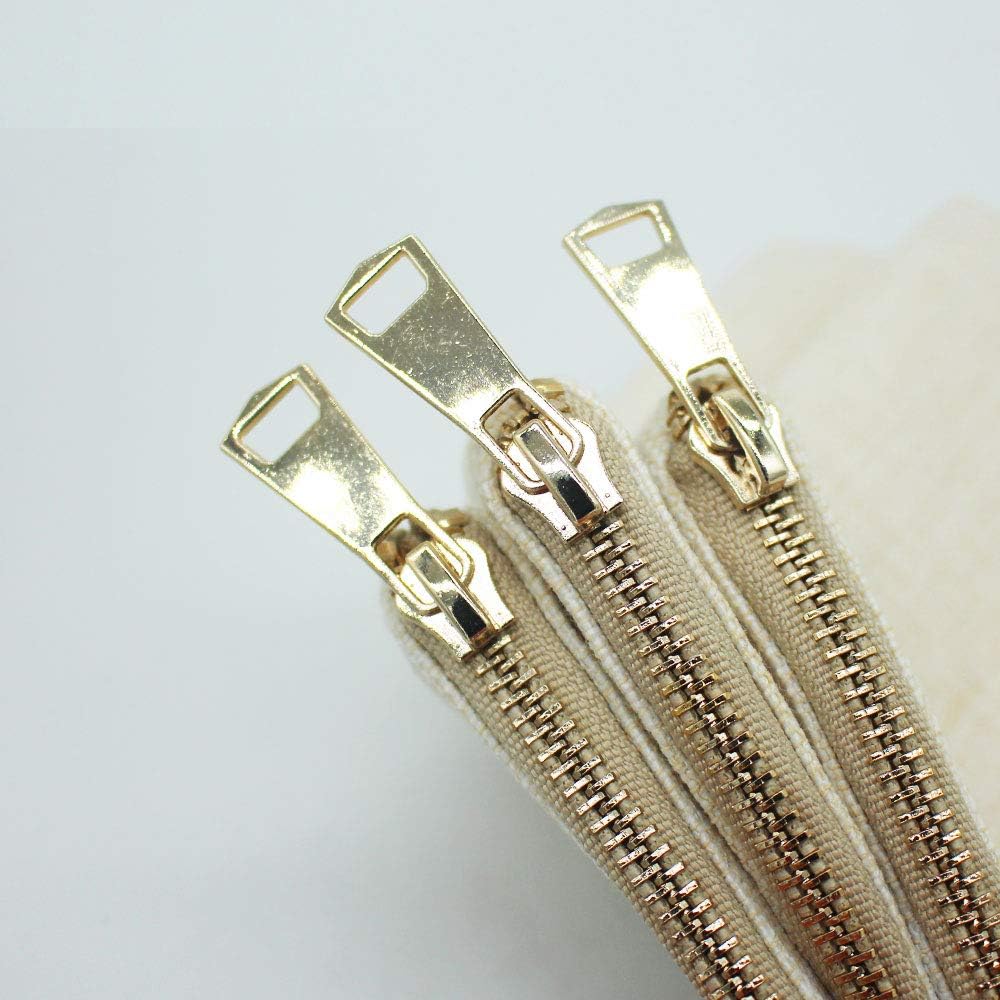Color: Beige, featuring a golden brass zipper with a fashion pull.