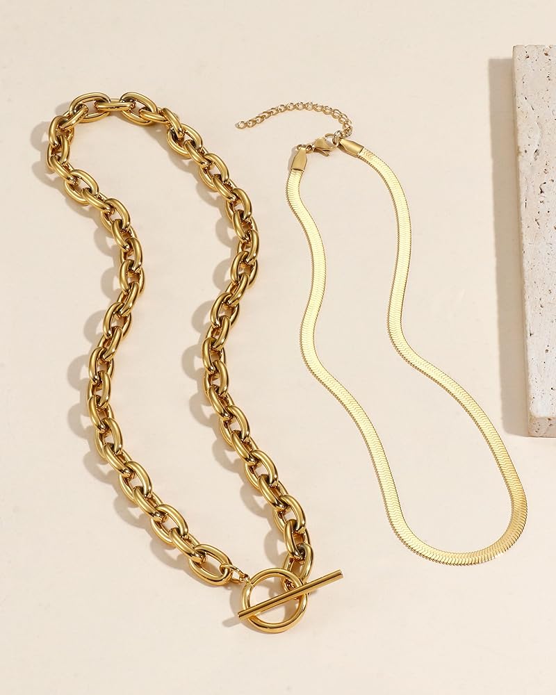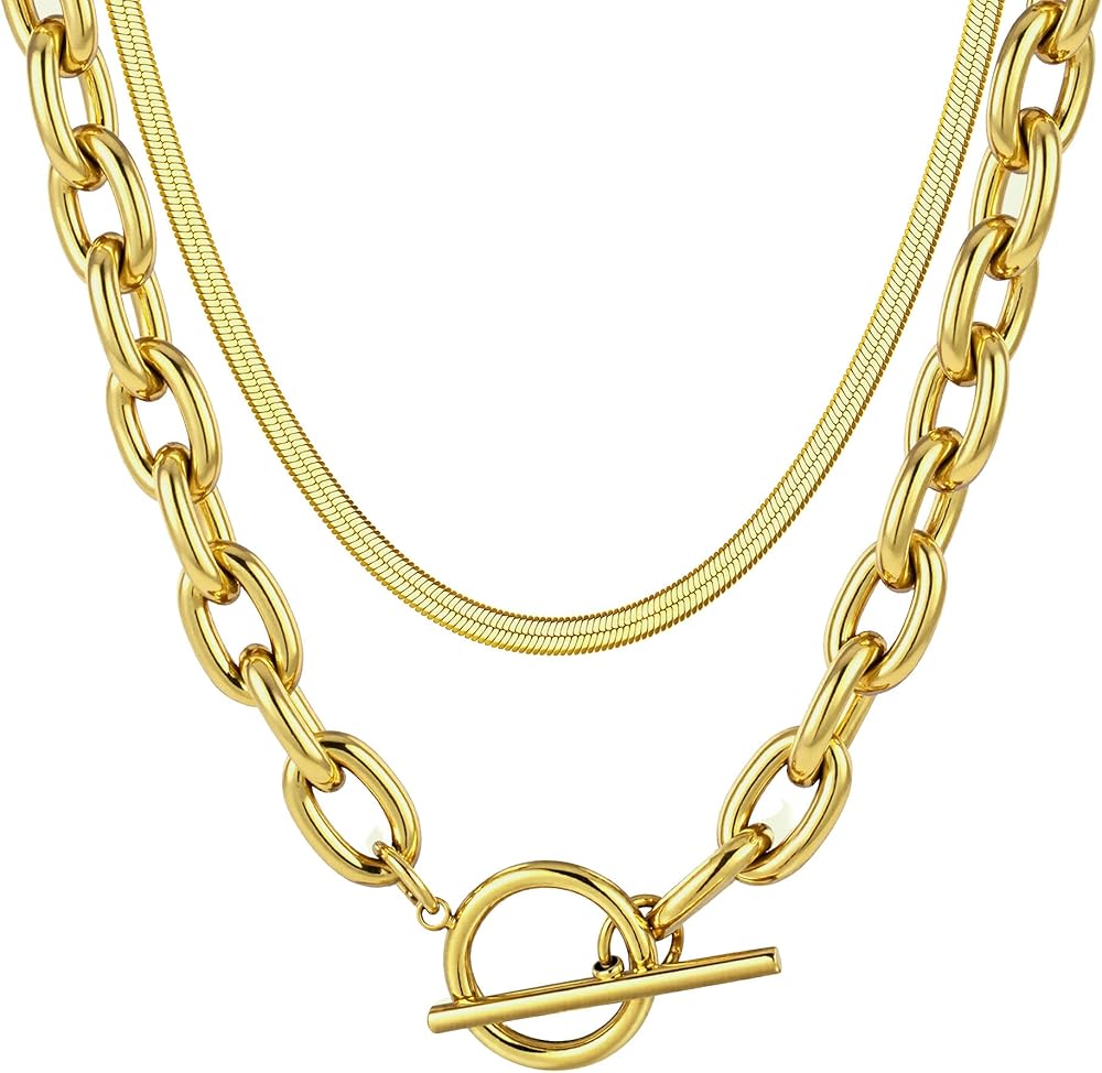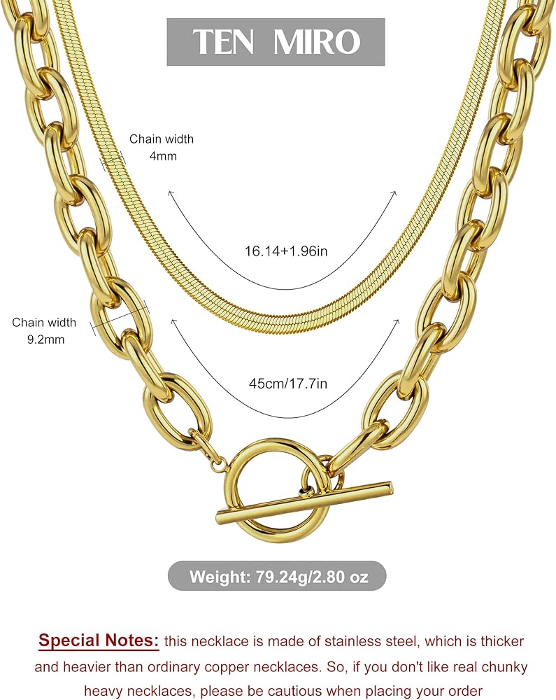 TEN MIRO 18k Chunky Gold Necklace for Women Sweatproof, Non Tarnish Chunky Layered Chain Necklaces Thick Gold Layering Herringbone Paperclip Necklace Stacks Toggle Necklaces for Women Men