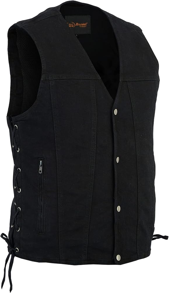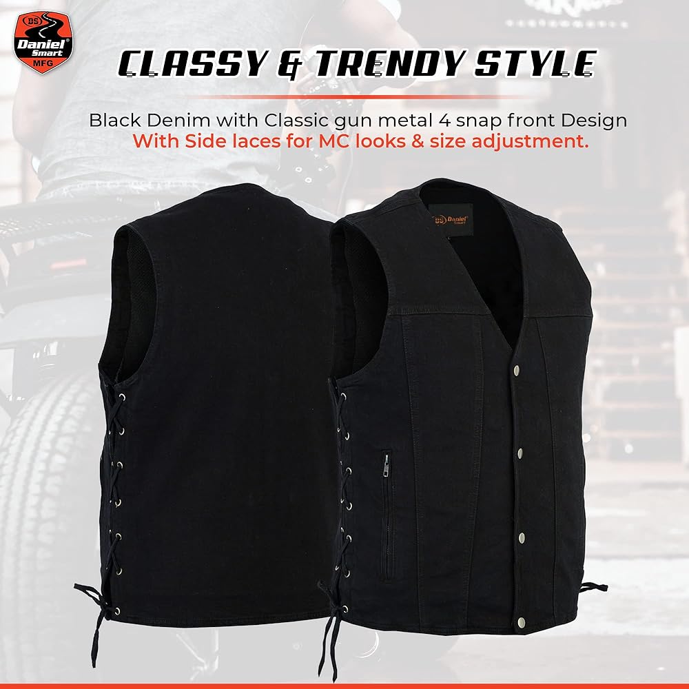 Fashionable and Attractive Design: If you're looking for a high-quality motorcycle mens denim vest at a reasonable price, Daniel Smart has you covered with a Unique blue & black denim motorcycle vests for men with a side laces Design that gives you a Classy and trendy style.