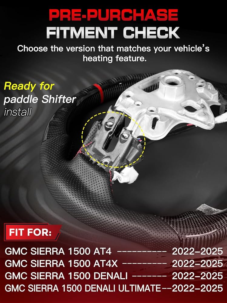 【Fitment for GMC Sierra 1500 2019–2024 (No Heat / No Paddle Shifters)】 Factory-style 1:1 fitment that preserves stock button layout and connectors. Not compatible with trucks equipped with steering-wheel heating or paddle shifters; this product does not add heating. Suits PRO/SLE/Elevation.