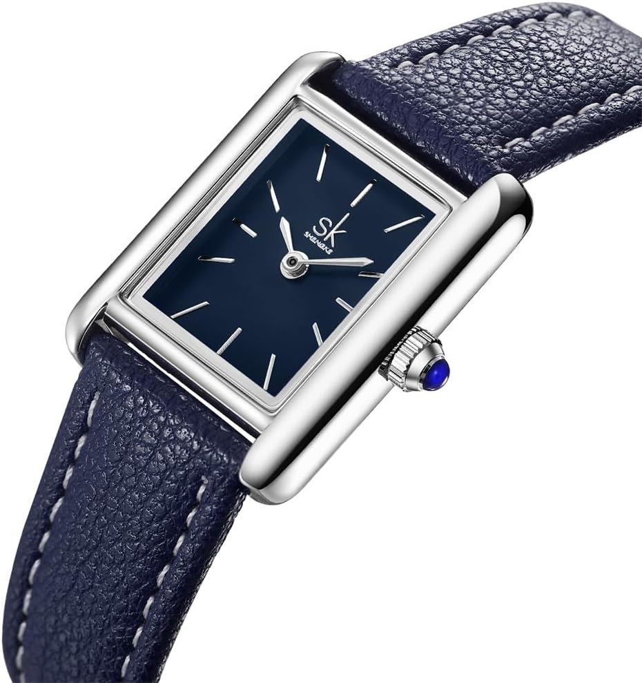 Minimalist Design: Silver classic vintage square case, dial bar scale with two hands, crown inlaid with blue crystal decoration , details show exquisite
