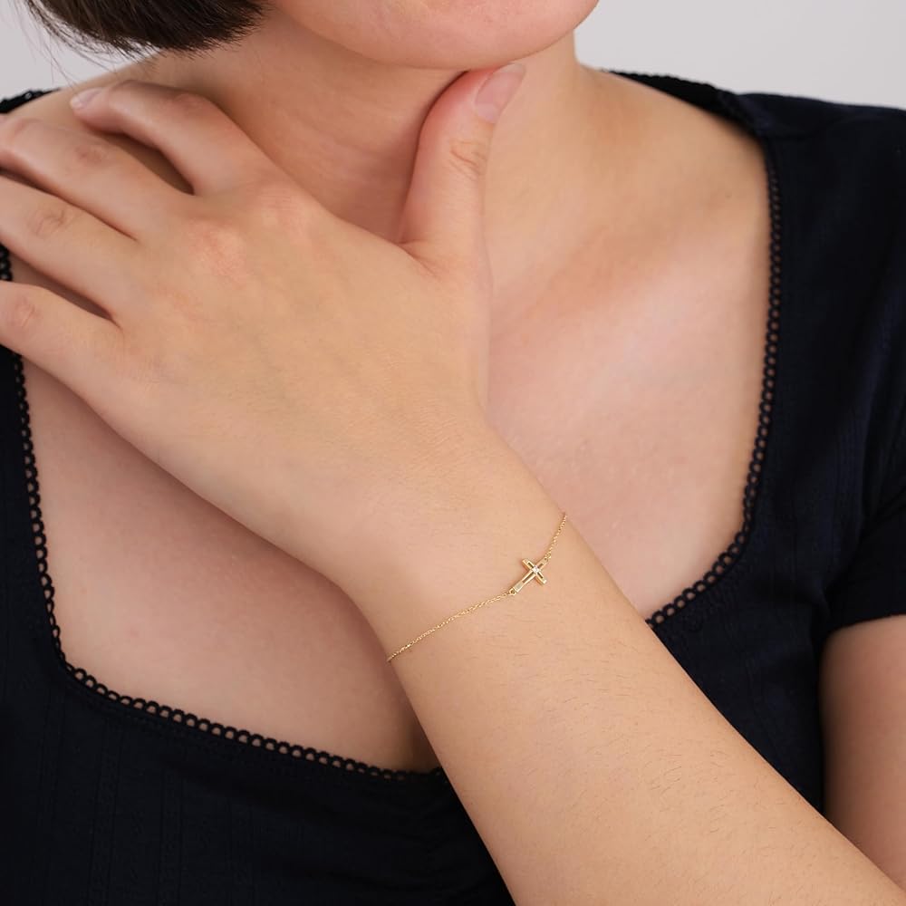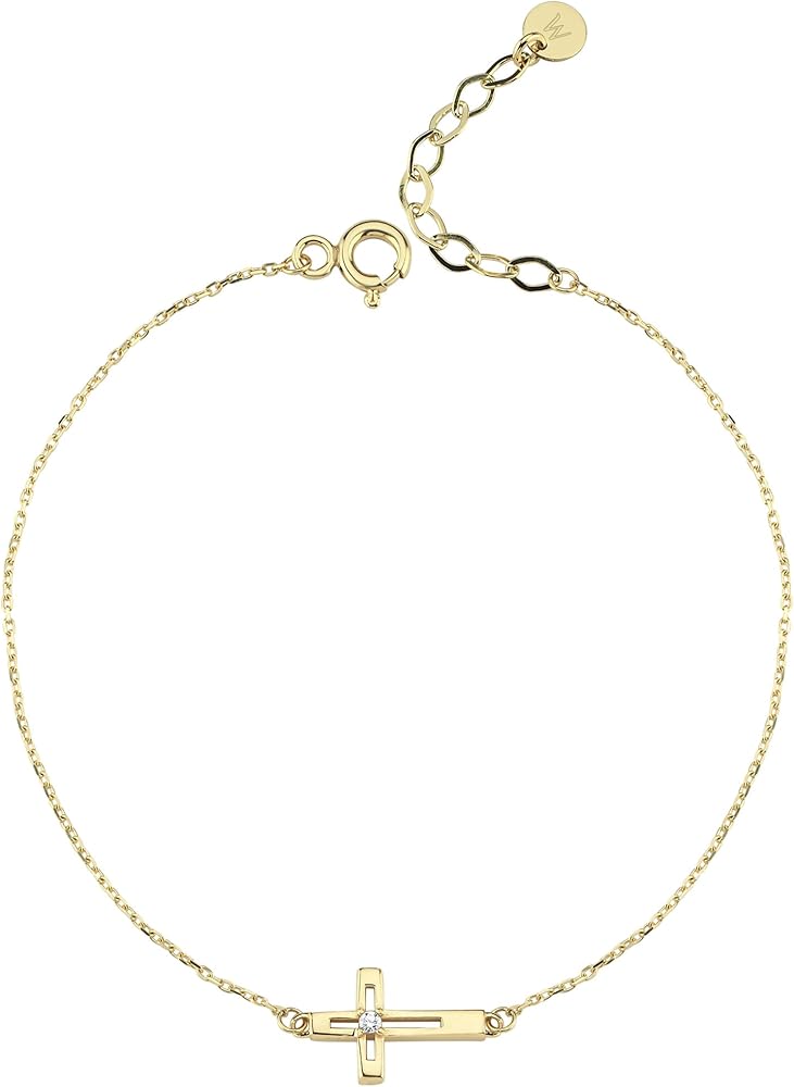 Wear Your Faith with Elegance The MIONZA 14k Gold Plated Cross Bracelet is a symbol of grace, belief, and timeless beauty. Designed for women who want to express their faith through fine jewelry, this sideways cross bracelet brings together spirituality and style in perfect harmony. Premium Craftsmanship Each bracelet is crafted with care and precision, featuring real 14k gold plating over a durable base metal. Its sleek and dainty design ensures long-lasting wear without compromising comfort or shine. Perfect Gift for Spiritual Moments Whether it's a baptism, confirmation, Easter, first communion, or birthday, this bracelet is a meaningful and elegant gift. It arrives in a beautiful gift-ready box, making it a cherished keepsake for your loved ones. Adjustable and Comfortable Fit Designed with an adjustable slider, this bracelet fits wrist sizes from 6.5” to 8” with ease. The minimalist sideways cross adds a modern twist to a traditional symbol, suitable for everyday wear or special occasions. MIONZA – Jewelry with Meaning At MIONZA, we believe every piece of jewelry should tell a story. Our collection is rooted in craftsmanship, faith, and meaningful design. Wear it. Gift it. Love it.