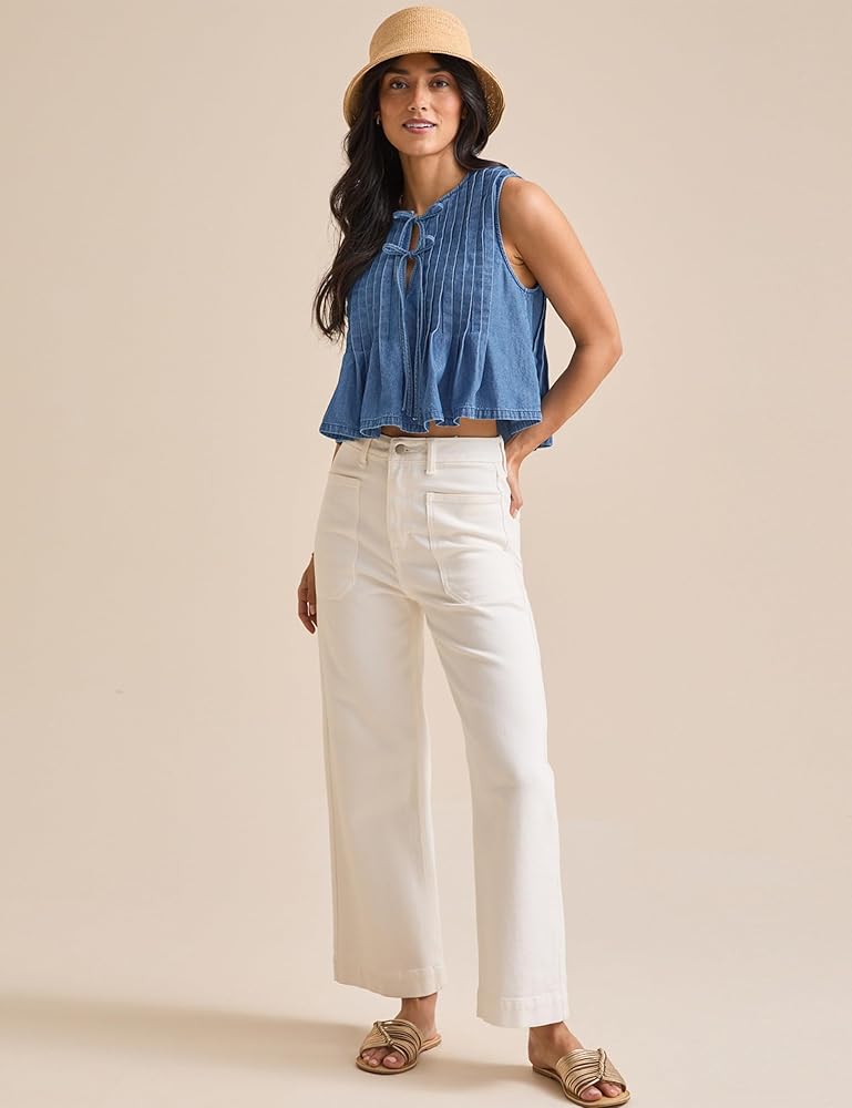 【Perfect Design】This jean vest top for women features an all-over pleated design that flatters your figure. The tie-front closure makes it easy to put on and take off, while adding a touch of sexiness. The jean top's overall look is full of stylish, well-designed details.