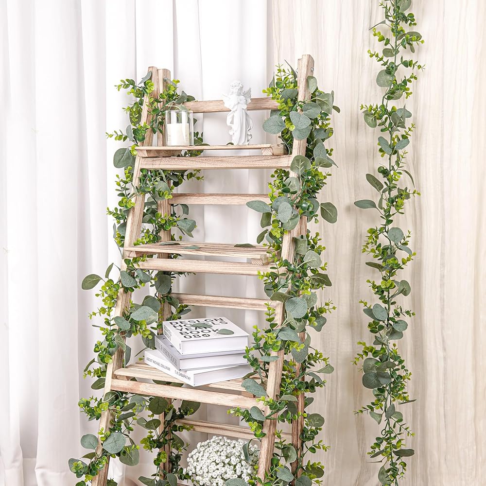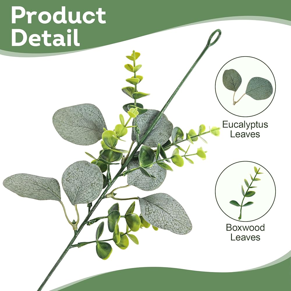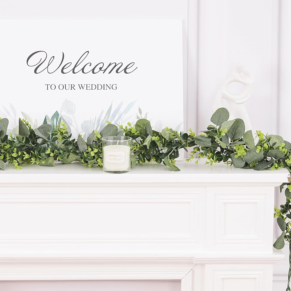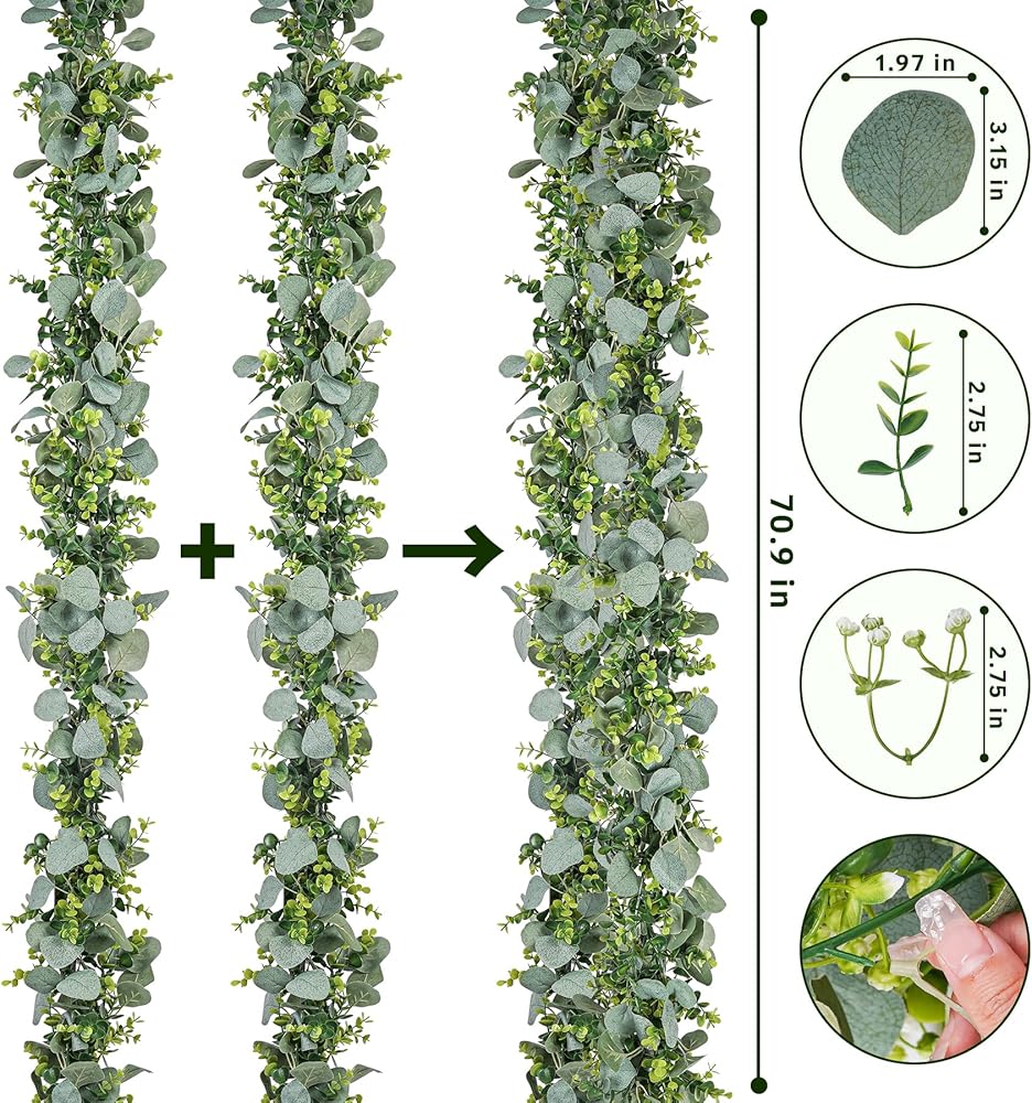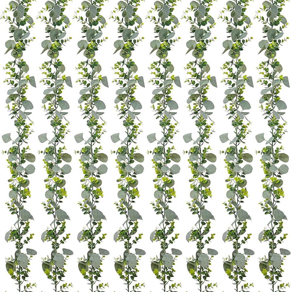 【Eucalyptus Garland Package】: Available in 2/4/8packs artificial eucalyptus garlands, Each faux eucalyptus leaves garland is appr. 5.9ft / 1.8 m in length. You can easily twist multiple garlands together for denser arrangements or cut them to fit your specific decor needs.