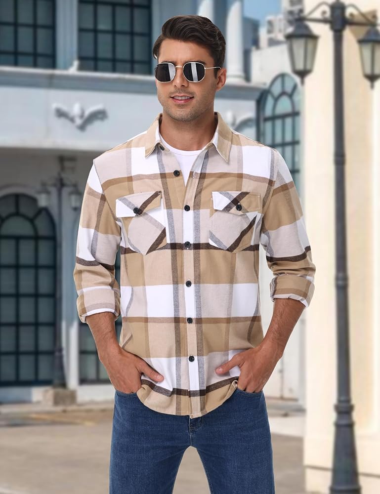 Stylish Design: Men's plaid shirt features a button closure, long sleeves, a curved hem, and two practical chest pockets to store all your necessities easily. The classic plaid pattern makes a versatile addition to your wardrobe.
