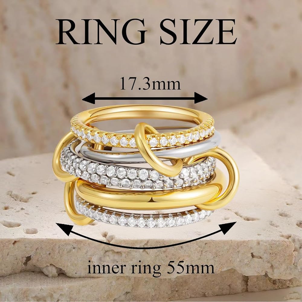Ring Set: The stackable rings consists of 5 rings connected together, including 3 silver rings and 2 gold rings. The overall design is simple and fashionable, adding a unique sparkle to your fingers