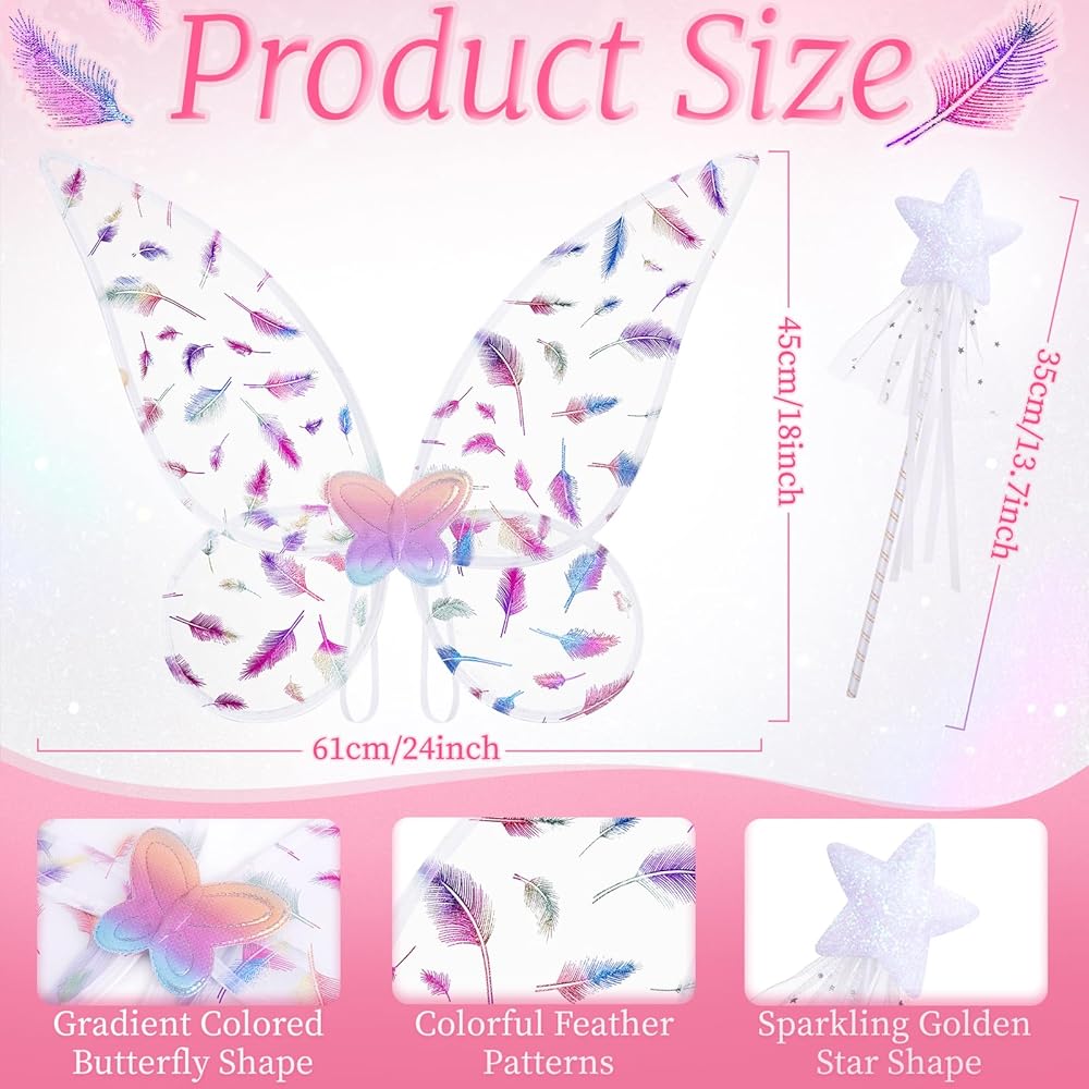 Perfect combination: The fairy costume set includes 1 fairy wing + 1 fairy wand, made of skin friendly materials, This fairy wings for girls and adults offers 4 color options and is perfect for Halloween cosplay outfits. Whether participating in parties or daily filming, you can instantly transform into a dreamy fairy and become the center of attention in the audience