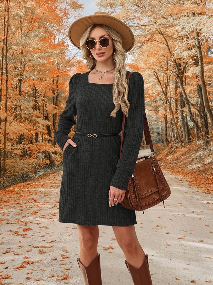 Cozy Soft Ribbed Knit Fabric–Lightweight long puff sleeve sweater dress with trendy square neck and practical side pockets,elegant classy and sexy,making it a great choice for aesthetic outfits in womens early fall and winter fashion 2025