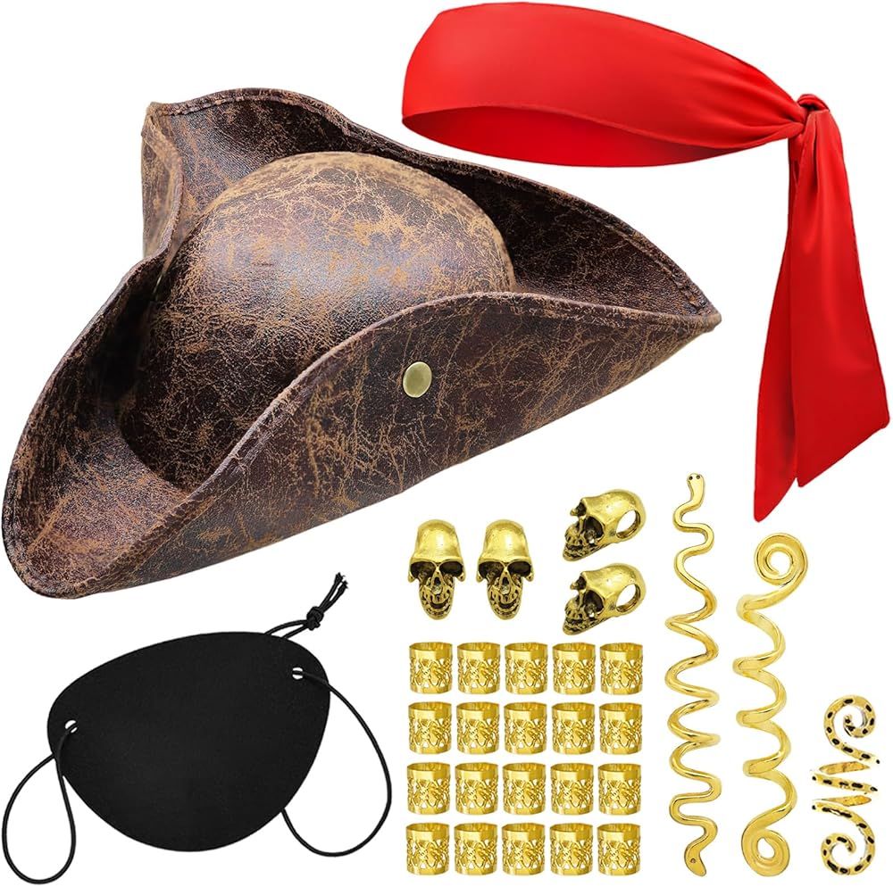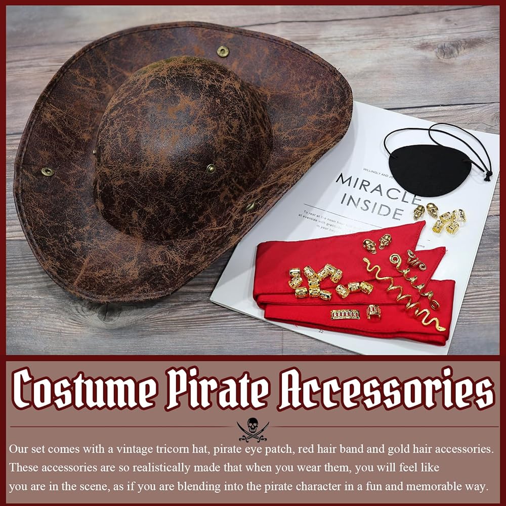 Pirate Accessories: Including 1pc faux leather pirate tricorn hat that looks like a real weathered and worn pirate hat; 1pc pirate eye patch; 1pc pirate headband; 4 pcs skull hair Beads and 23 pcs beard braids hair cuffs or 1pc skull coin pendant necklace