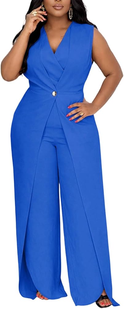 STYLE: Discover the epitome of elegance with the Sleeveless Slit Leg Jumpsuit. Its wide pant legs gracefully cascade to reveal captivating thigh-high slits, while the fitted waist, adorned with a chic button, adds a touch of sophistication.
