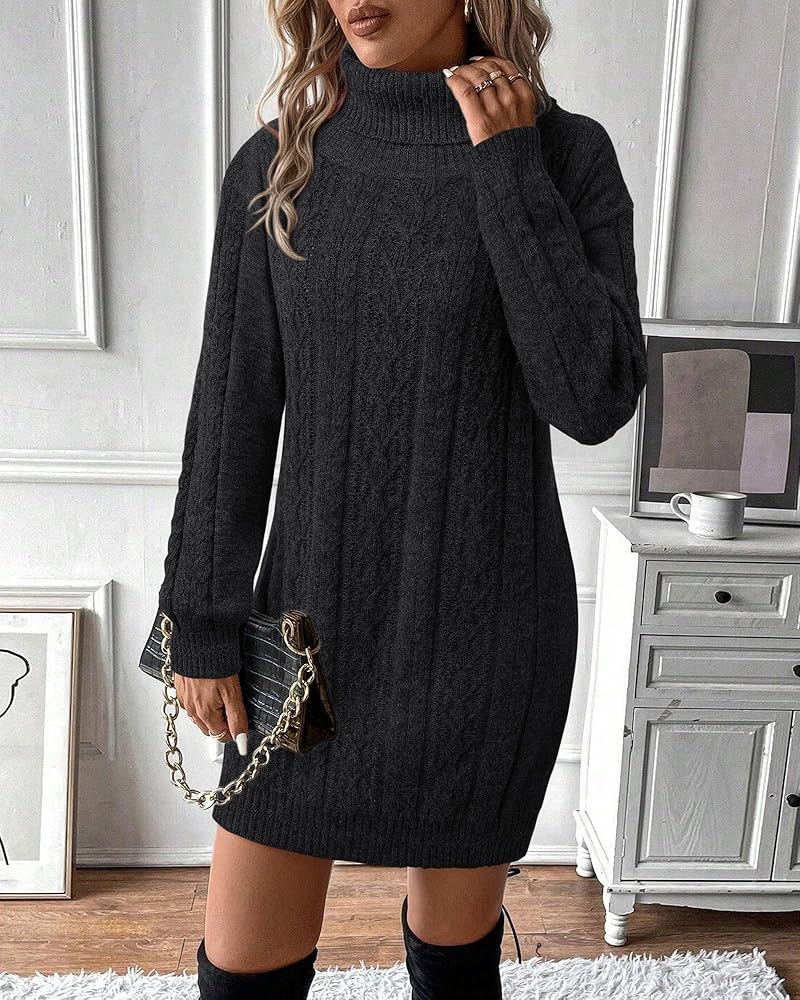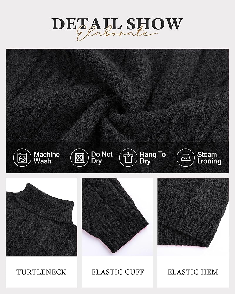 Material: 50%Viscose+30%Polyamide+20%Polyester. cozy sweaters for women made of skin-friendly high quality knitted material. Featuring a chic turtleneck and delicate cable-knit detailing, this dress offers both cozy neck protection and a flattering silhouette that elegantly frames your face. Perfect for creating a sophisticated, artistic look during the fall and winter seasons.