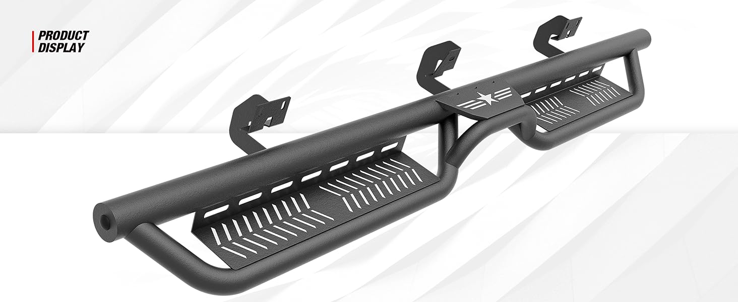【Functional Design】:① The side steps feature a dual - layer layout, offering greater convenience for vehicles equipped with lift kits and oversized tires. It also facilitates easy access to the vehicle's roof.② The 6 - inch drop - down step pads provide excellent accessibility for pickup trucks with lift kits and oversized tires, while maintaining sufficient ground clearance.
