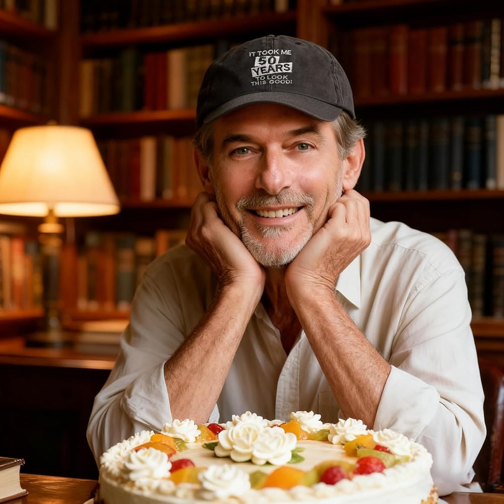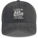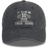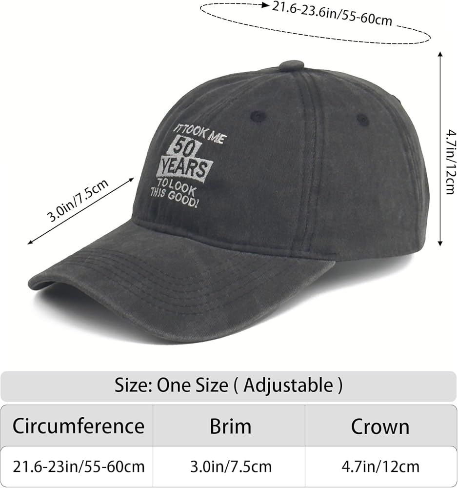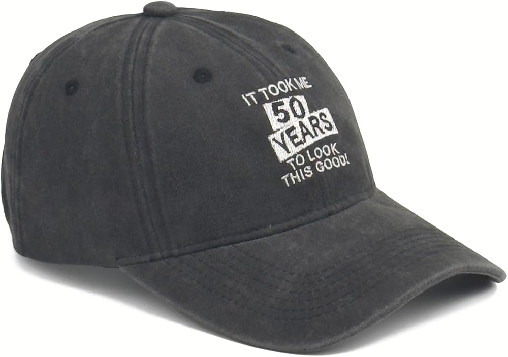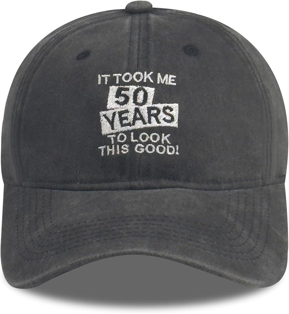 Unique Birthday Design – Featuring bold embroidery with milestone numbers and playful icons, Embroidered with 'It Took Me 50 Years to Look This Good' and a playful thumbs up icon, making it a fun and meaningful accessory for milestone celebrations.