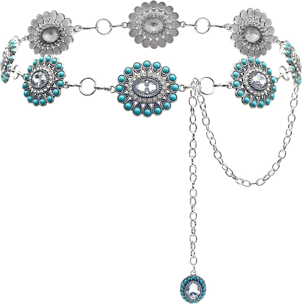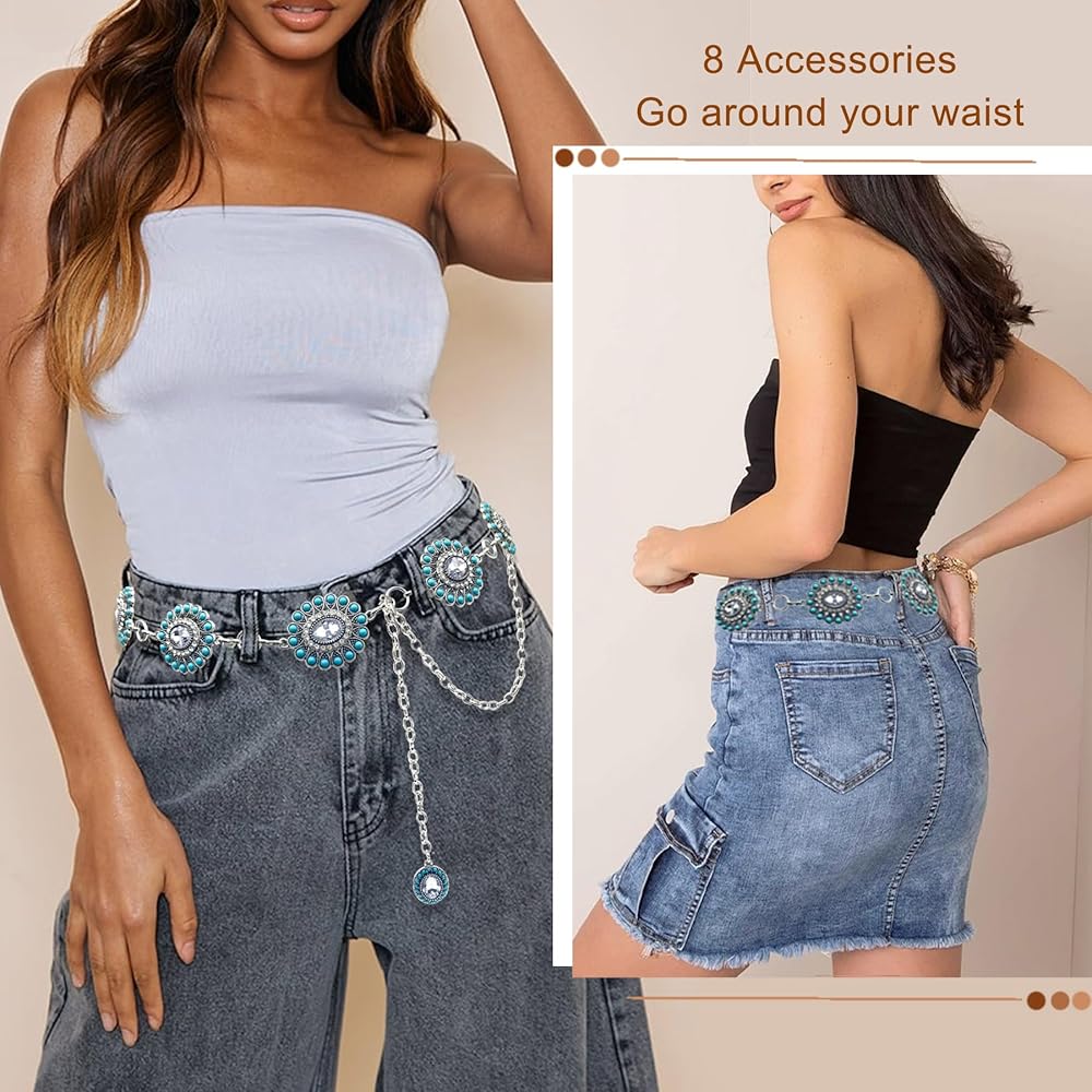 Mesmerizing Western Elegance: Unleash your inner cowboy or cowgirl with our Concho Belt, a dazzling embodiment of Western style. Crafted with turquoise and rhinestone detailing, each concho boasts a shimmering allure that captures the spirit of the Wild West.