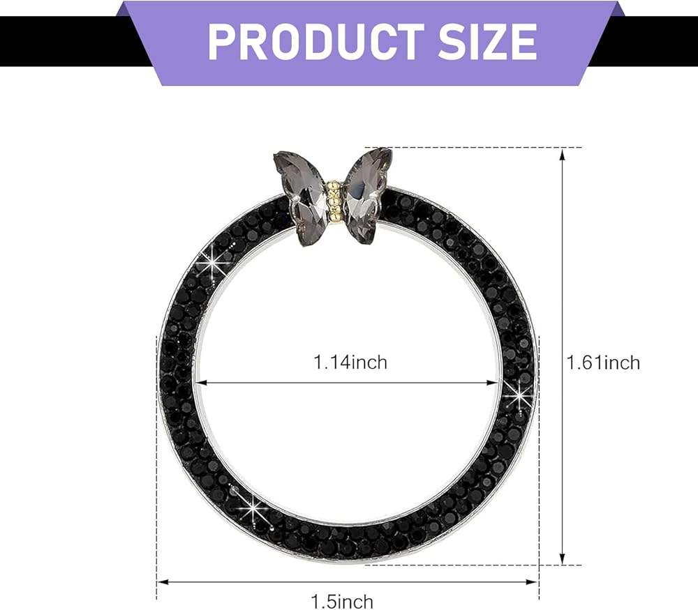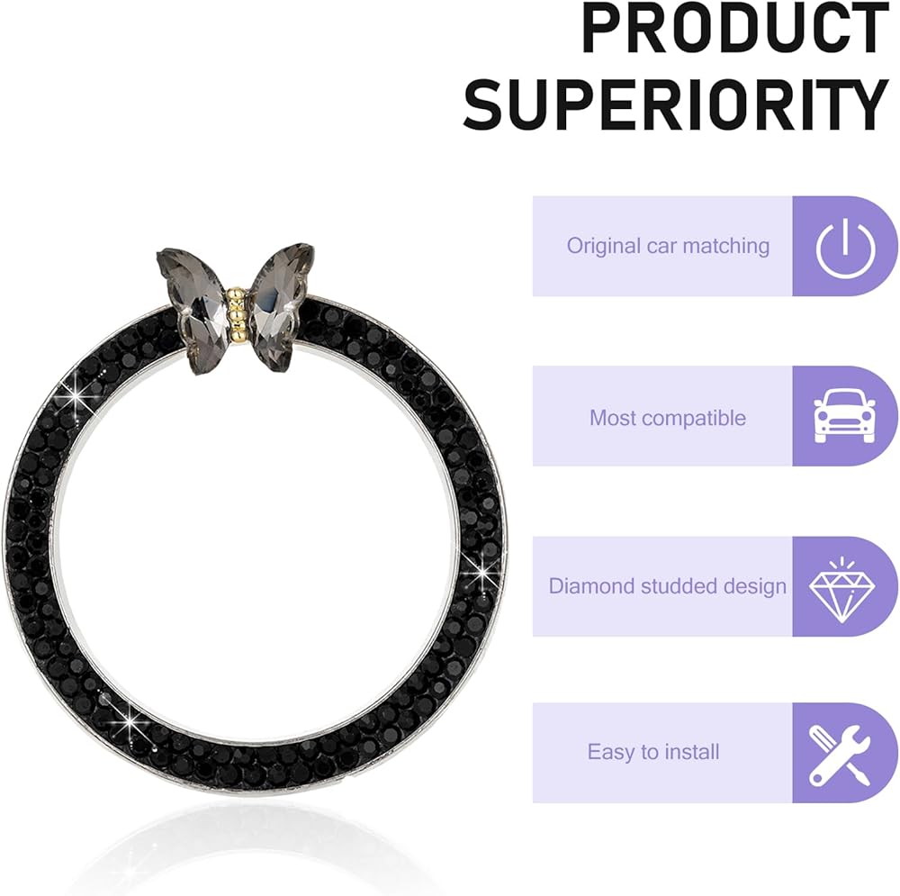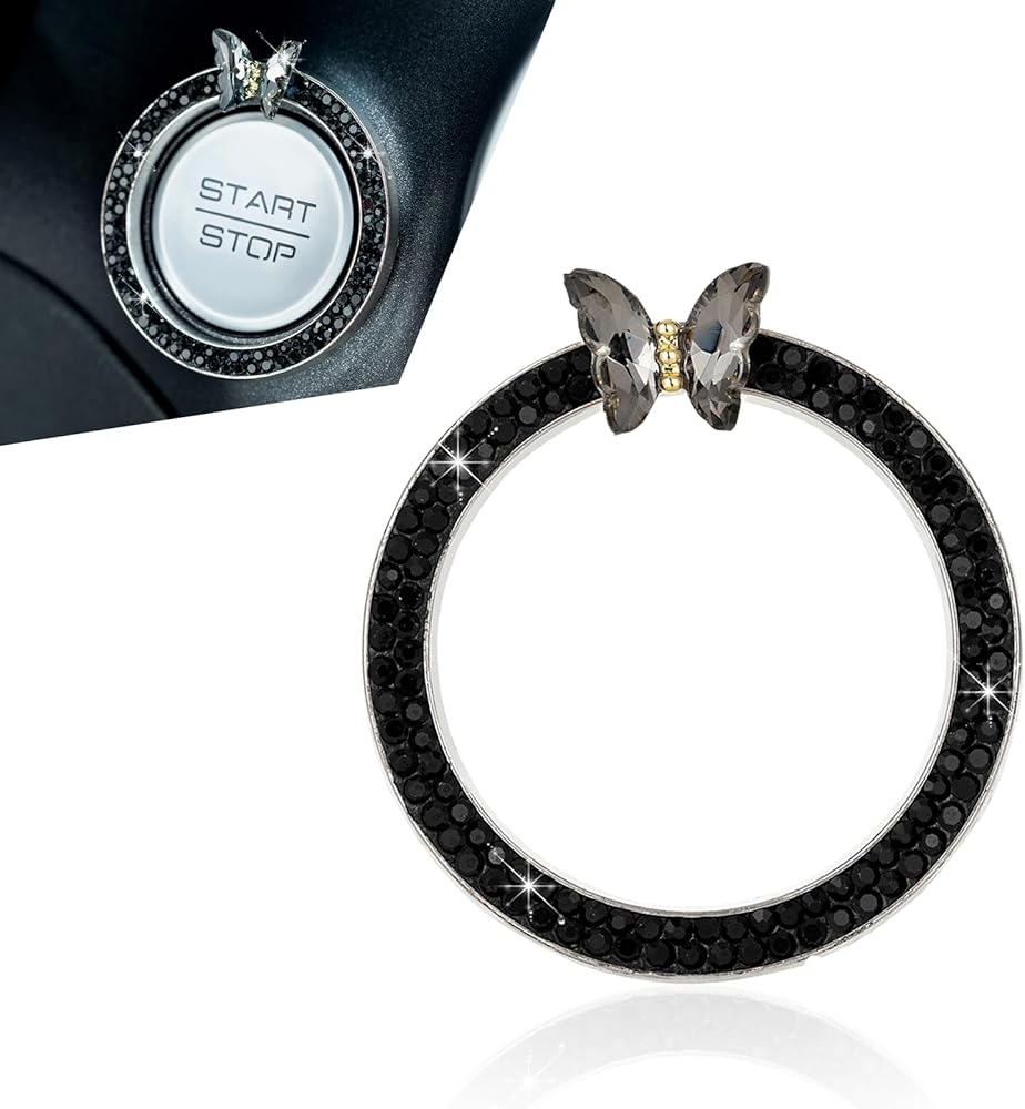 Bling Push Start Button Cover, Sparkling Butterfly Ring Emblem Car Accessories, Girly Car Engine Start Button Cover, Key Ignition Knob Decoration with Rhinestones for Women (Black)