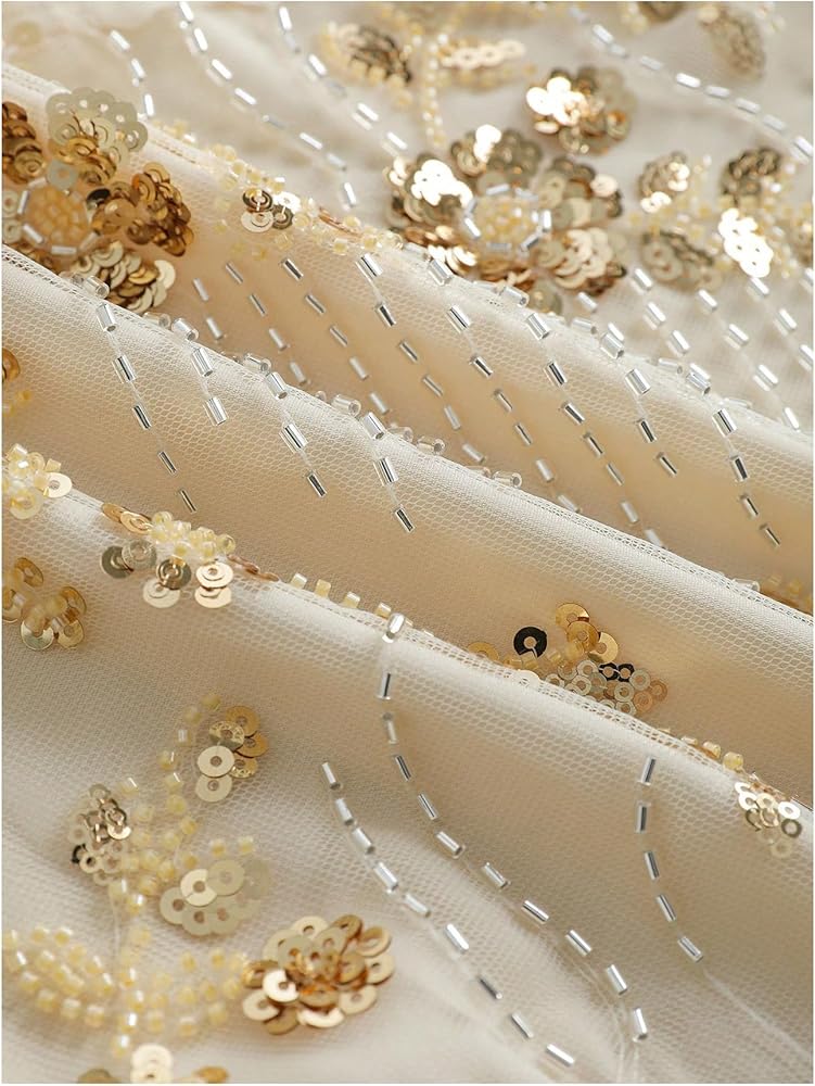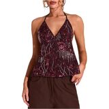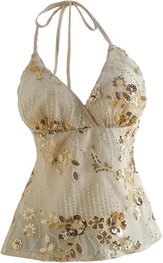 - Features: Sequin embellished, beaded, halter v neck, tie back, sleeveless, halter top
