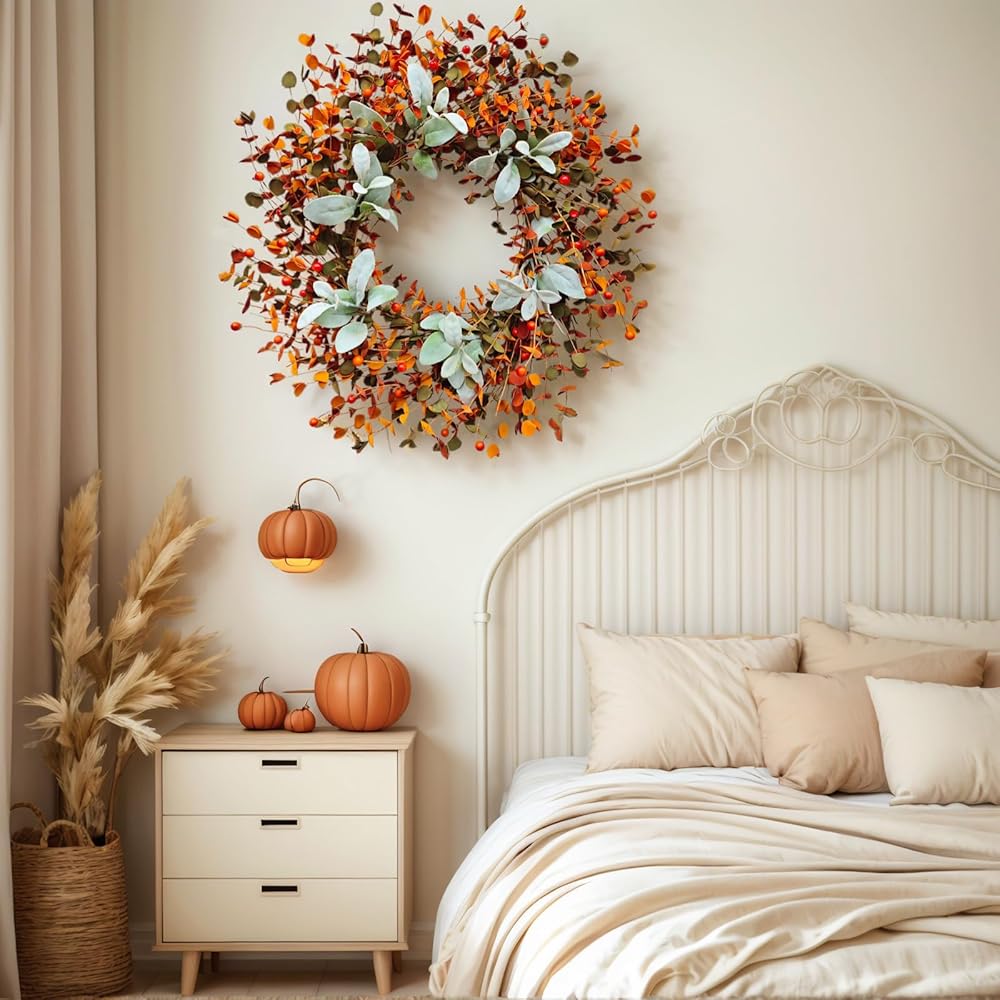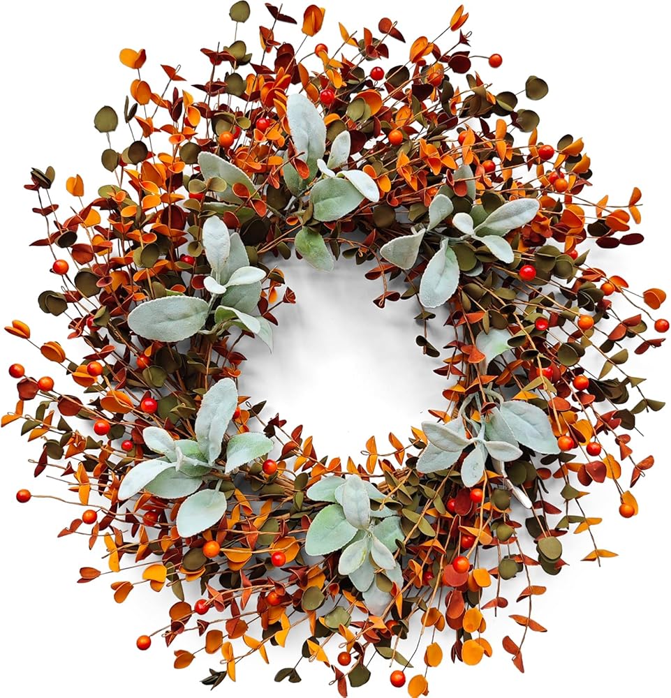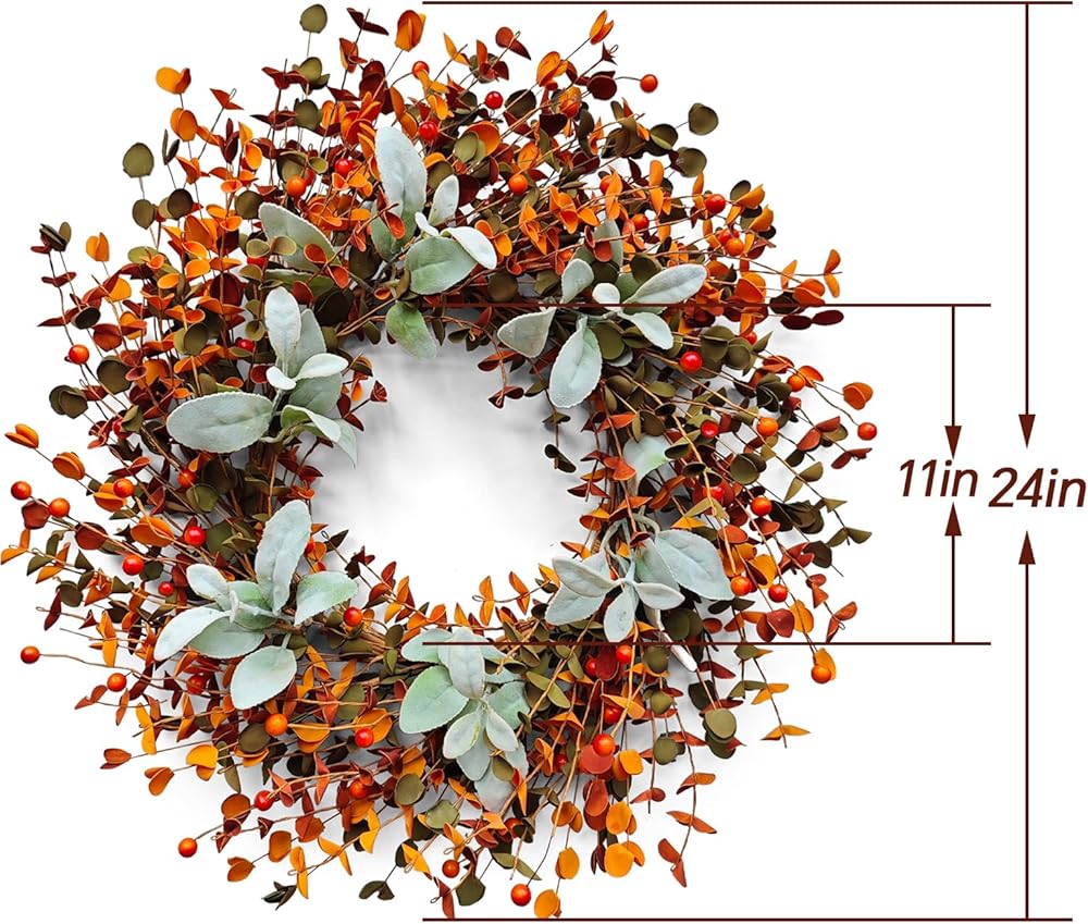 【Elegant Autumn Design with High-Quality Faux Foliage】- Crafted with realistic eucalyptus, boxwood, and lamb's ear leaves in rich autumn shades of deep red, burnt orange, and emerald green. This designer-style wreath instantly adds seasonal charm to your home décor, featuring delicate leaf textures and layered colors.