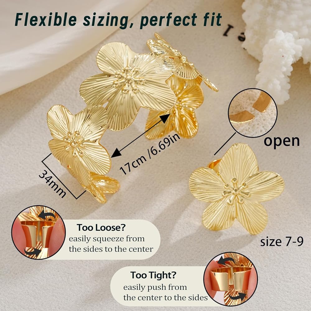 Size:The ring size is 8 and can be slightly adjusted. Gold Chunky Bangle (4mm width) and Flower Bangle (34mm width) feature inner diameters of 20cm (7.87in) and 17cm (6.69in) respectively. With a smooth open cuff design that effortlessly fits wrists 6-8 inches (15-20cm).