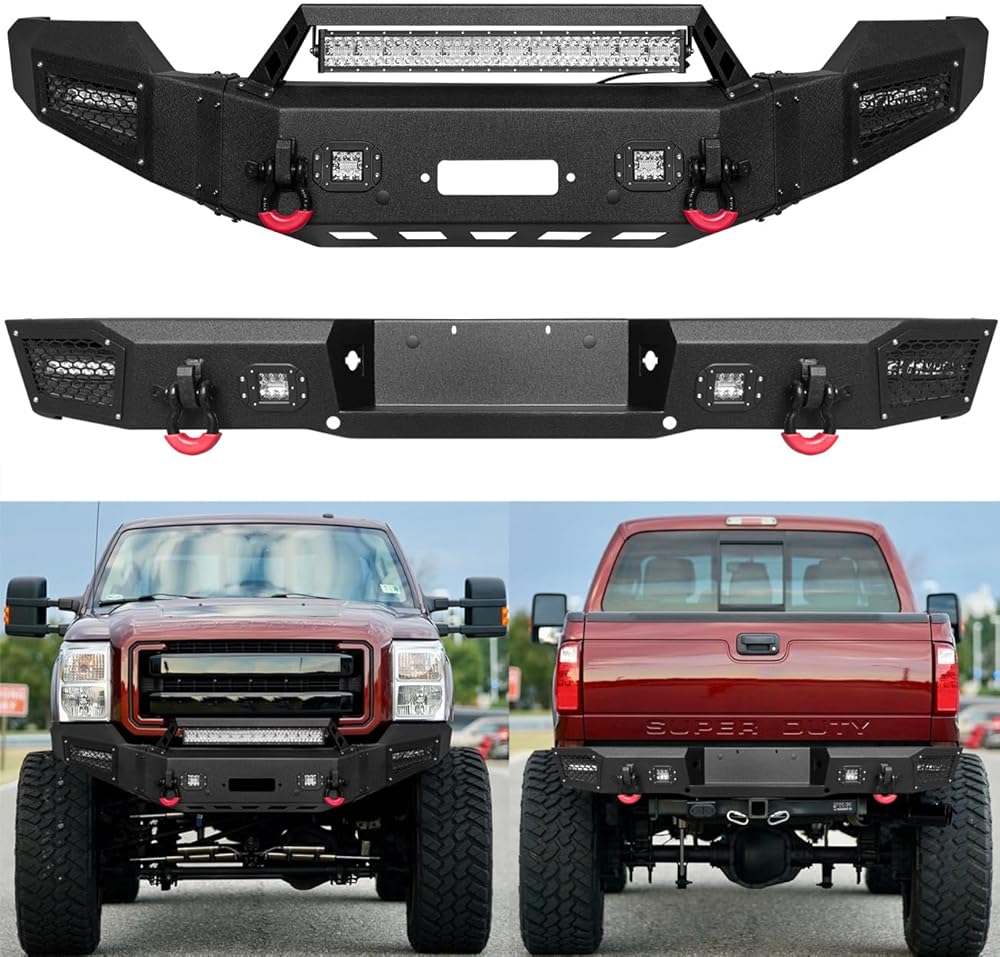 [Heavy Duty Construction]: The bumper body is made of heavy-duty, high-strength 7/64-inch steel, and the winch plate and mounting brackets are made of 3/16-inch steel. The front bumper weighs approximately 143 lbs and the rear bumper weighs approximately 87 lbs, both packages are shipped separately