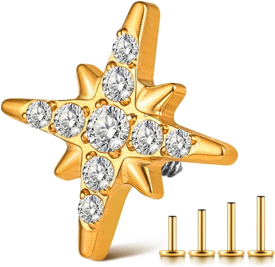 1PC ASTM F136 Titanium Threaded(0.9mm internal) Super Stars CZ Tops Piercing studs for Conch,Tragus,Helix,Lobe Come With 4PCS Different Lengths Post 16G 18G 20G Flatback earring nose Jewelry Gold Silver