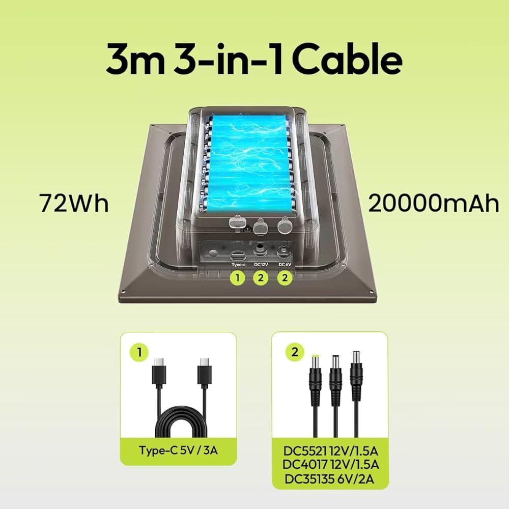 【High-Capacity Solar Power】Introducing our 8W solar panel kit, equipped with a massive 72Wh 20000mAh rechargeable battery, designed to provide reliable and continuous power supply for some type-C & DC input security cameras and hunting cameras, solving the hassle of battery replacement or wiring for users.