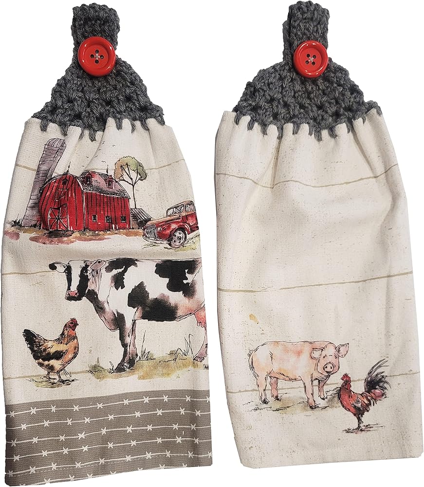 Handcrafted Grey Crochet Topped Farm Animals Kitchen Towel Pair