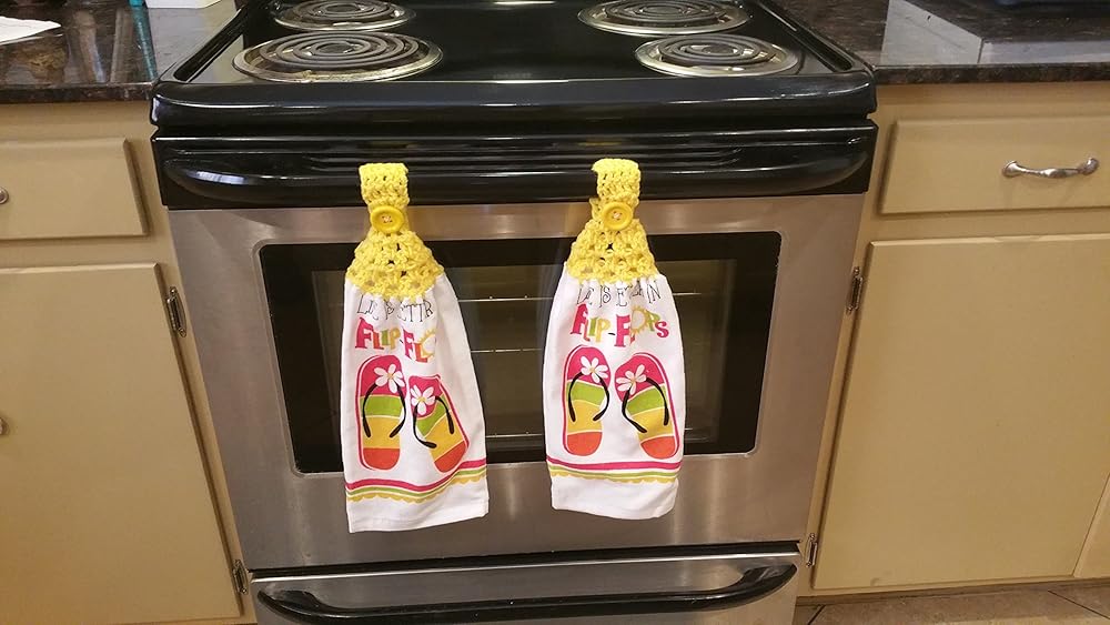 Hand Towel for the Kitchen with Crochet Top and Giant button for Hanging on your Stove Handle