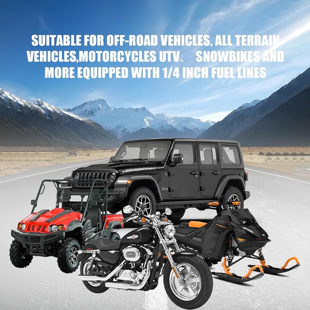 Product Szie: This inline fuel filter has an overall length size of 2.12 inches, a top half length size of 1.03 inches, a bottom half length size of 1.03 inches. The top width size is 0.88 inches, the top bore size is 0.26 inches, the bottom bore size is 0.11 inches. Its suitable for off-road vehicles, ATVs, motorcycles, UTVs, snowmobiles, and other vehicles equipped with 1/4-inch fuel lines.