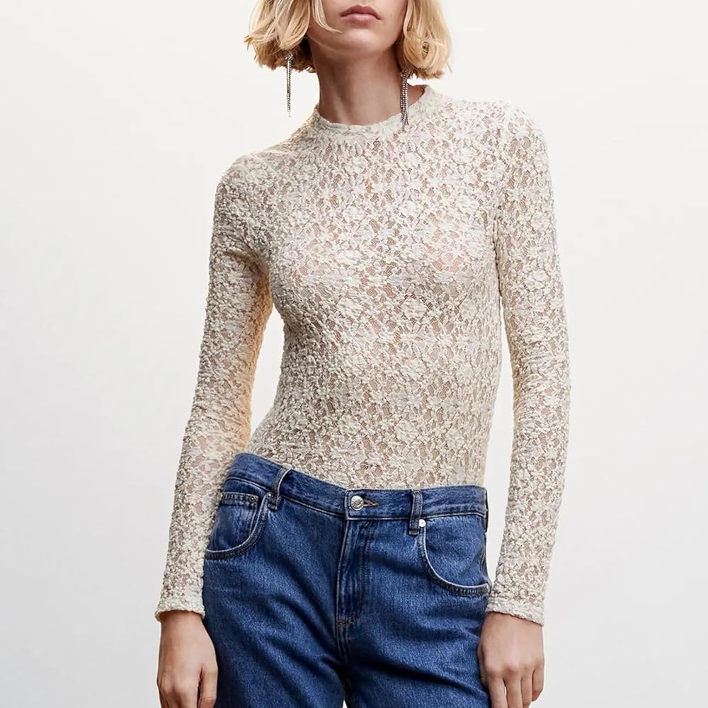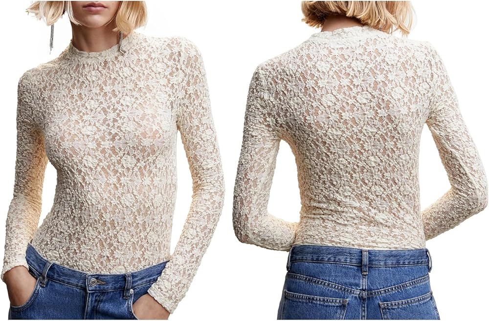 Sheer Mesh Long Sleeve Layering Tops for Women Crew Neck Floral Lace Blouse Sexy See Through Going Out Shirts