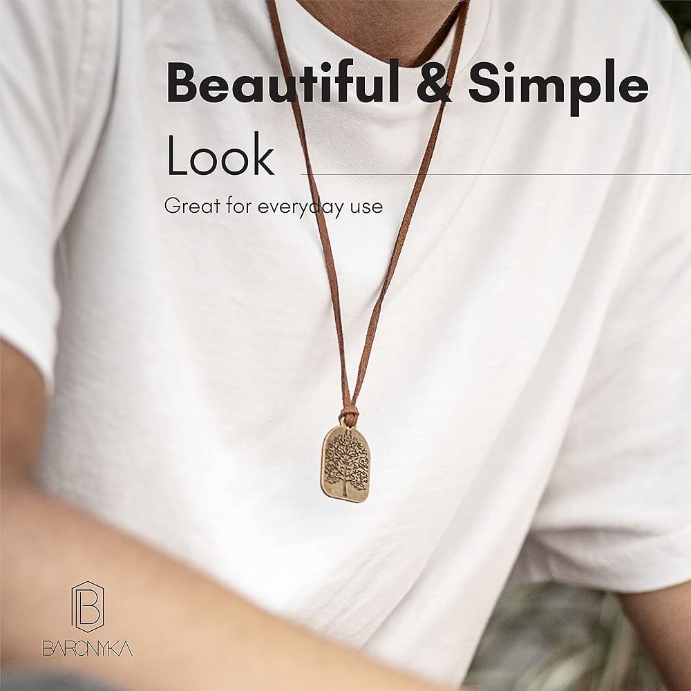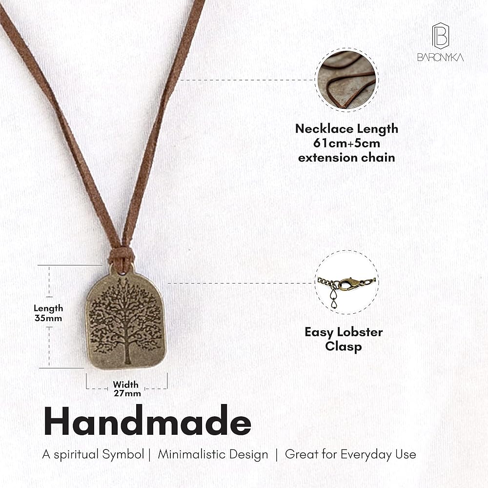 Baronyka Handmade Tree of Life Pendant Leather Necklace for Men, Bronze-Plated Brass, 24" with 2" Extension Brown Vegan Suede Leather Necklace, Easy Lobster Clasp, Spiritual Tree of Life Jewelry
