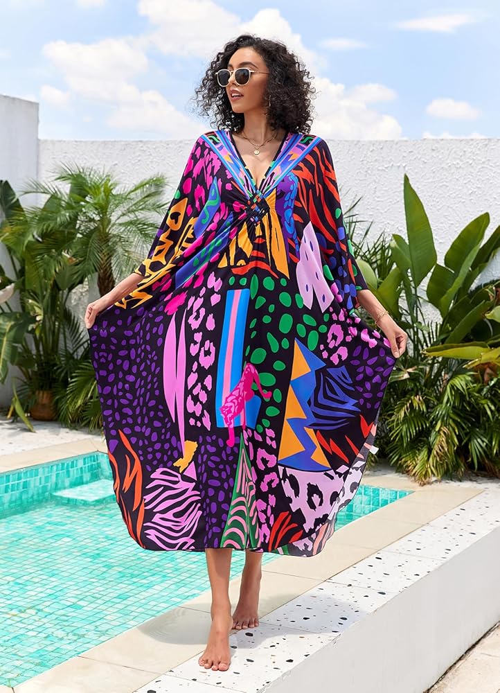 V-neck Beach Cover up caftan with woven-block neckline, batwing sleeves, and side slits - muumuu-inspired loose fit in floral/animal prints for swimsuit cover-ups.
