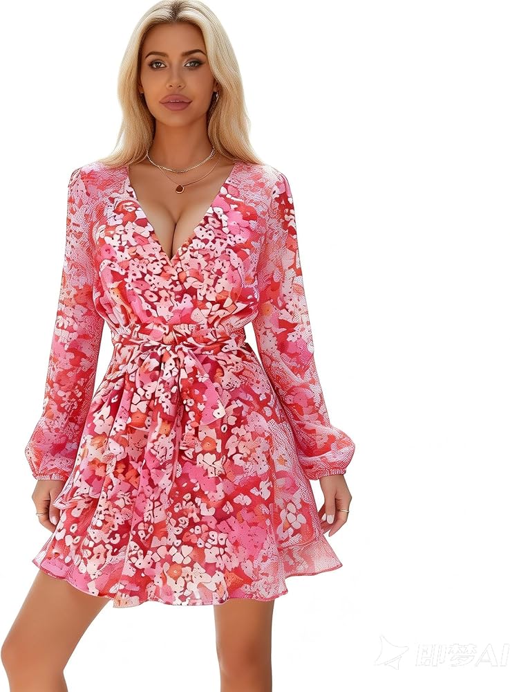 DESIGN: Chic Tee Dress, Elegant Wrap Front & Sheer sleeves with elastic on cuff , Tie waist Flirty & Feminine Ruffled Skirt – This mini skater dress features a playful ruffle hem that adds movement and charm, perfect for a stylish, romantic, trendy styles ,elevate your spring/summer wardrobe .