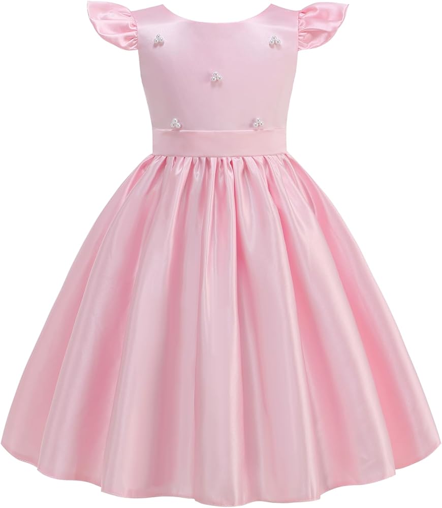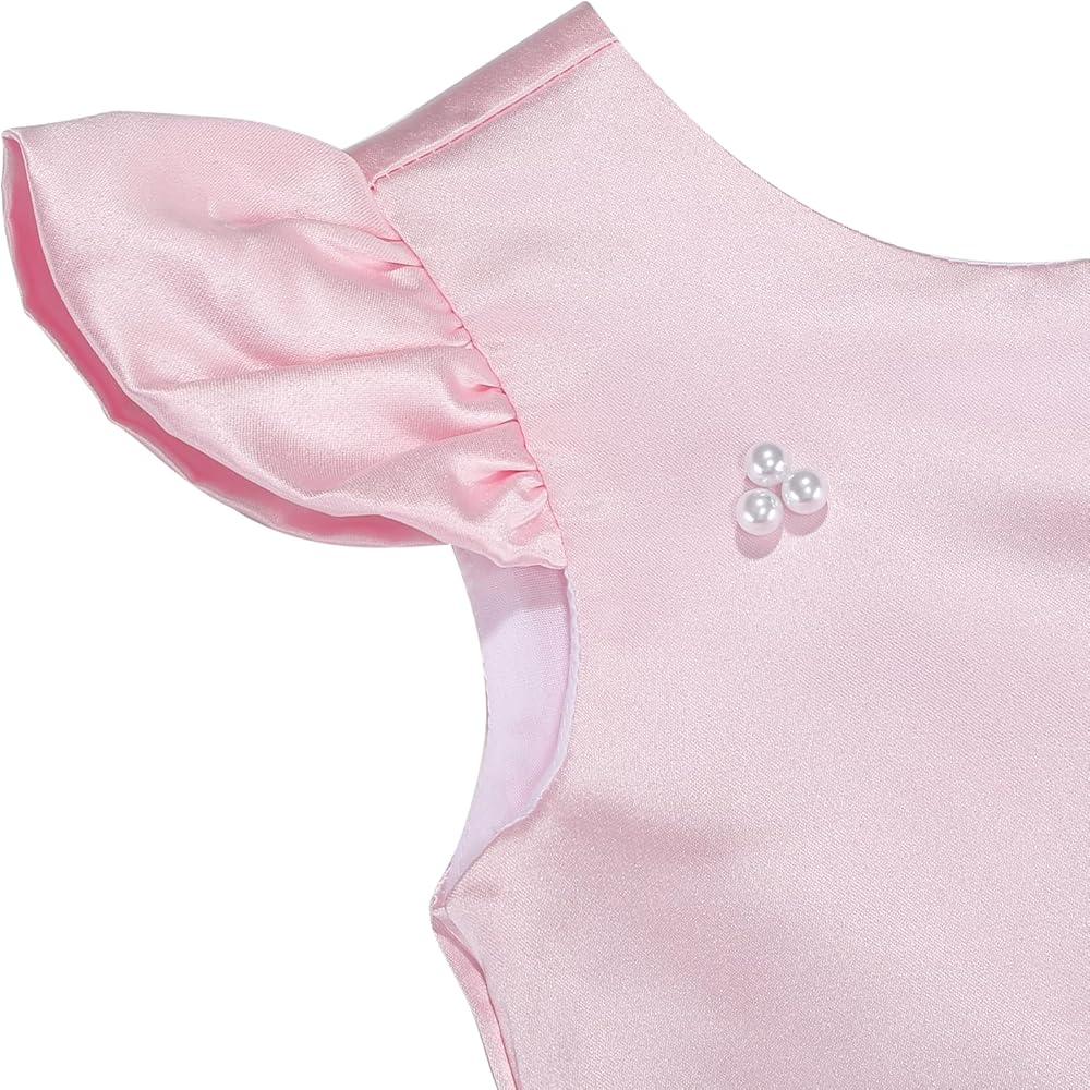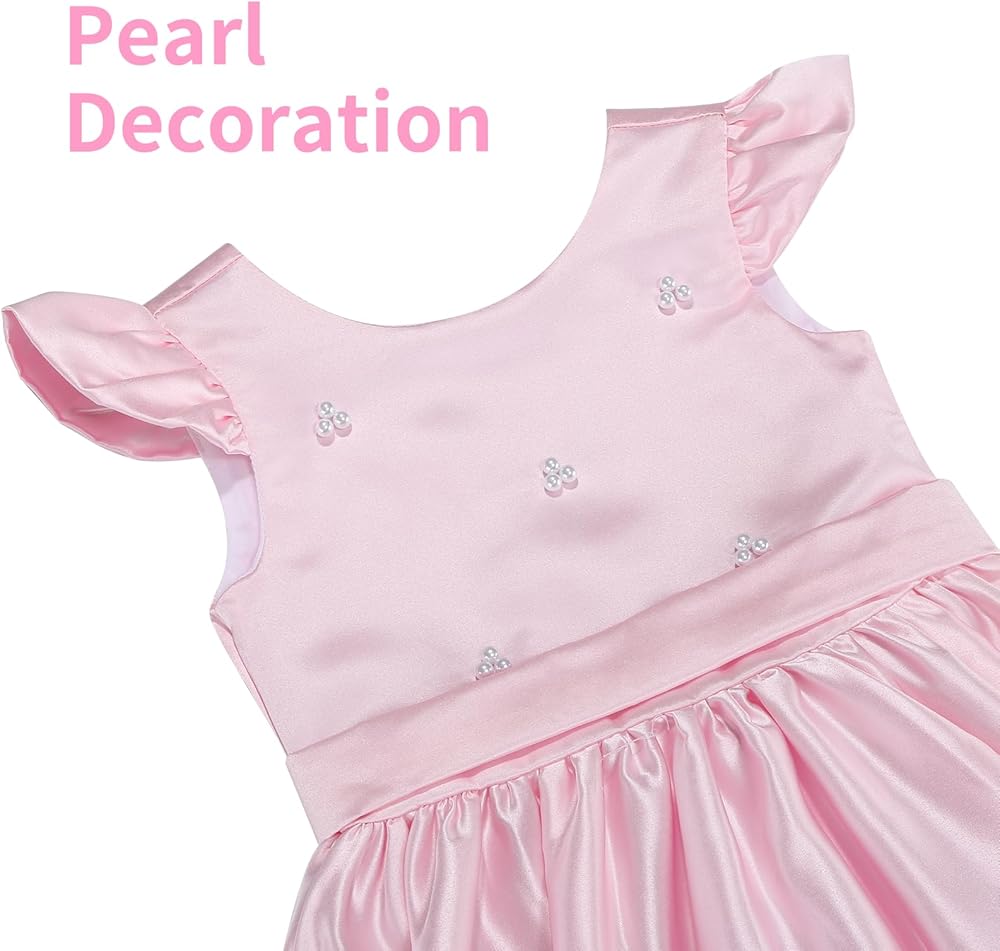 Elegant Design:Satin Body with Delicate Pearls,fluttery short sleeves add a dreamy touch,V- back detail and detachable satin bow adds elegance,perfect for wedding ceremonies, flower girls, baptisms, or first communions.