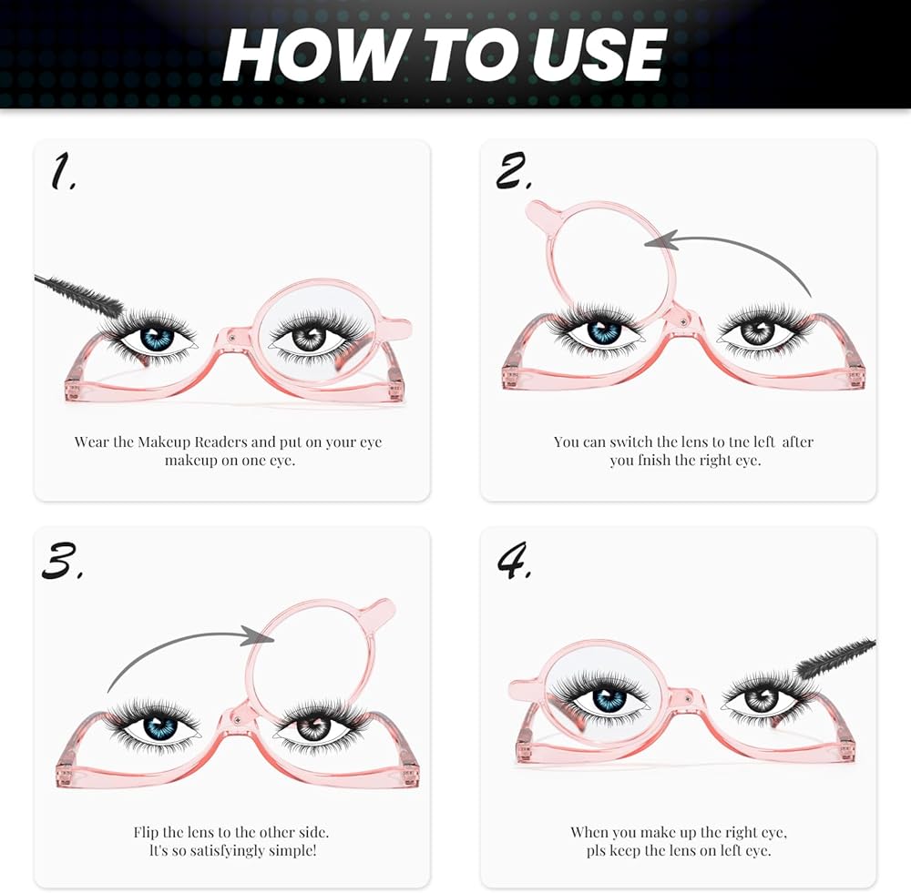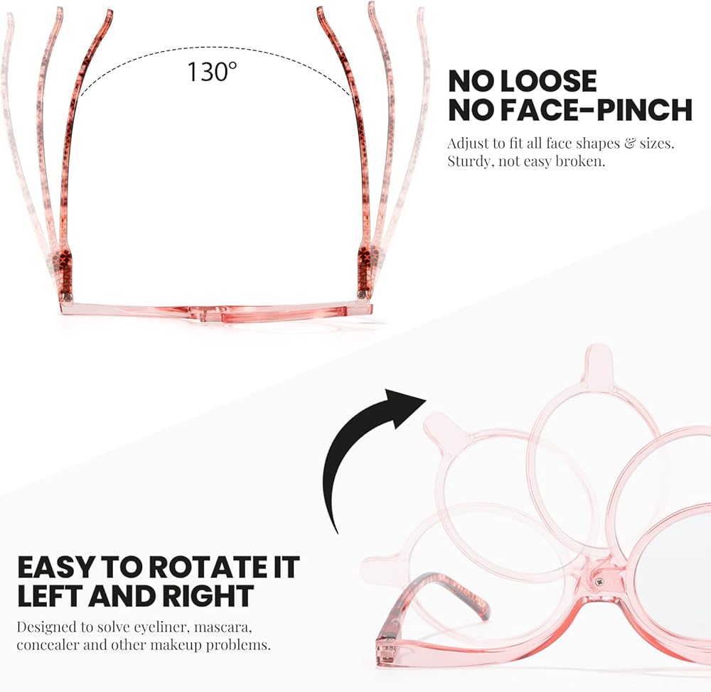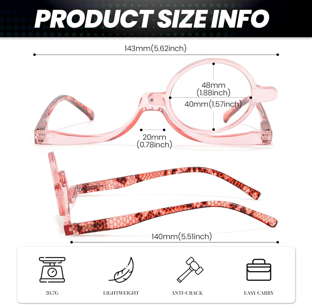 One Eye Rotating Magnification: These makeup reading glasses feature a unique one-eye rotating magnification lens. This design allows you to easily switch between normal and magnified vision, making it perfect for precise makeup application and other detailed tasks.
