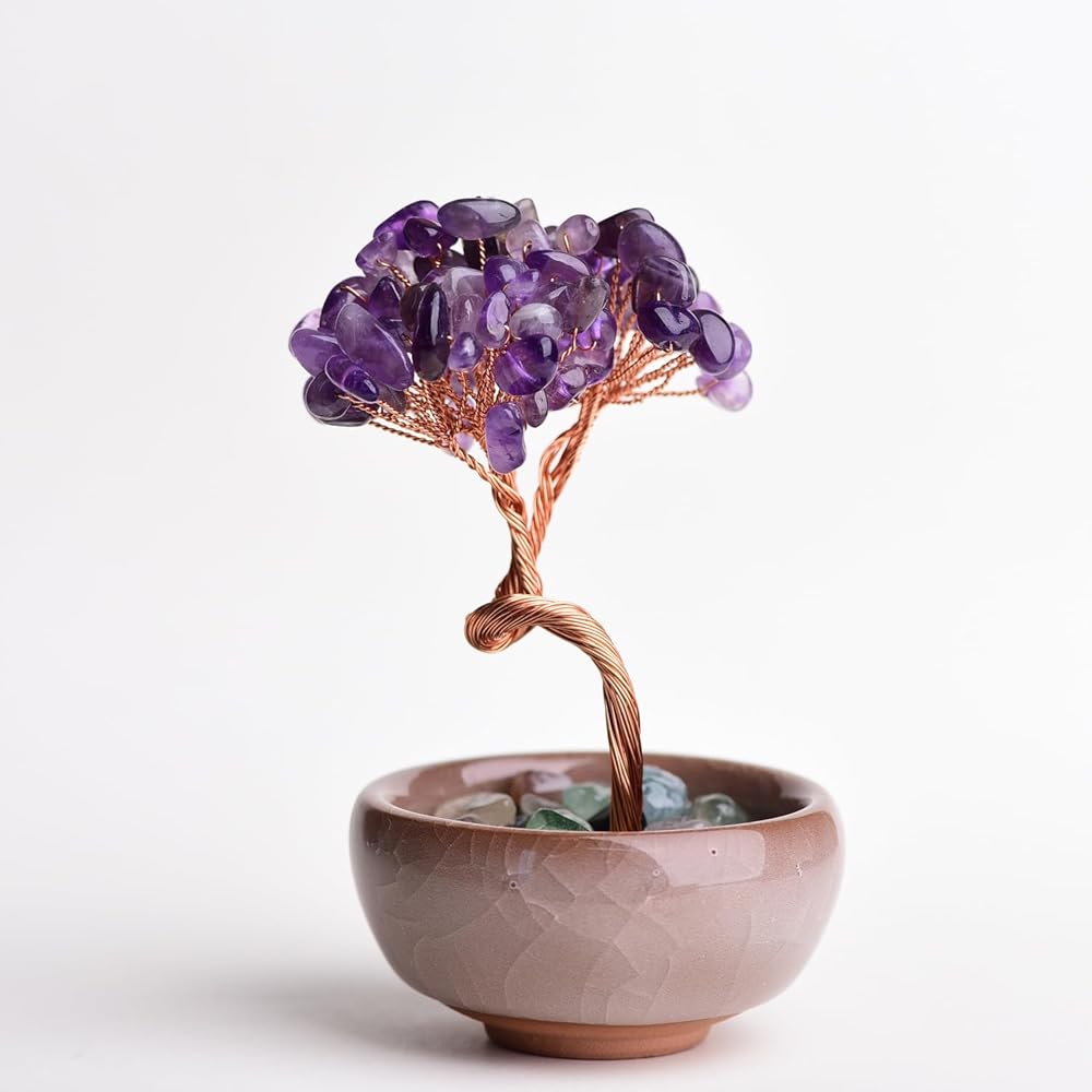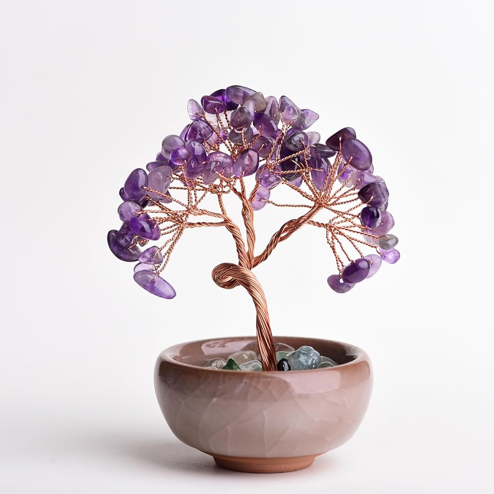 Crystal Tree of Life 7 Chakra Healing Crystal Trees for Home Decor with Ceramic Base Handmade Stone Feng Shui Bonsai Money Trees for Women Birthday Gifts (Amethyst)