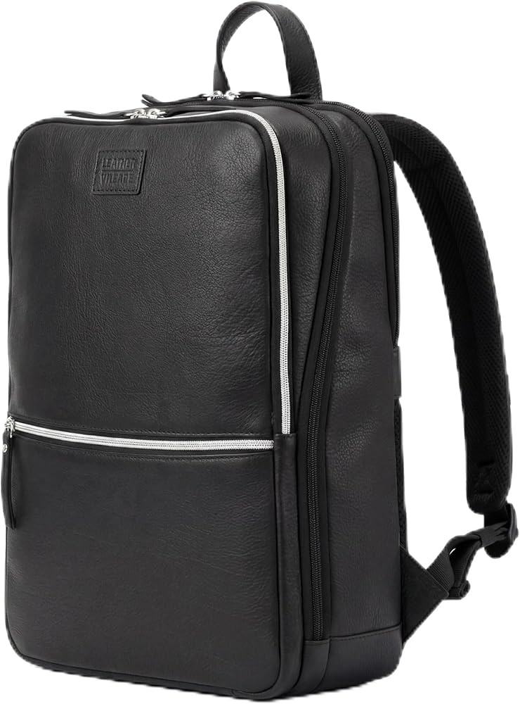 LEATHER VILLAGE Leather Laptop Backpack for Men | Black | Slim Professional Business Bag Fits 15.6"-Laptop | Water-Repellent Work & Travel Daypack with Trolley Strap