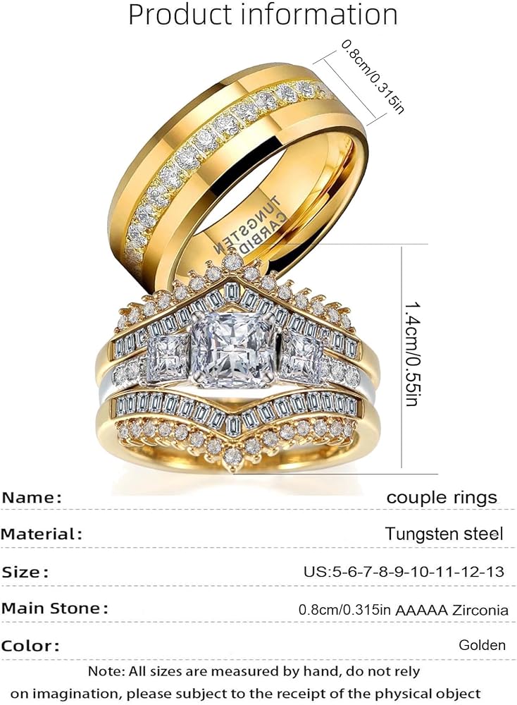 Material: Women's ring - 5A grade cubic zirconia with gold plating; Men's ring - tungsten steel with gold plating.