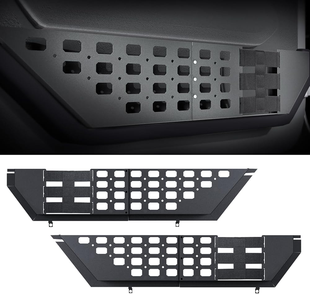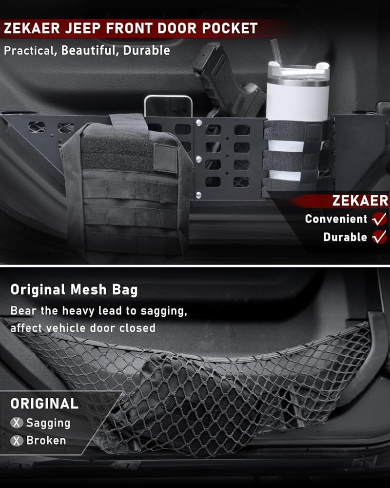 Expanded Storage: This Wrangler JL/JT storage accessory is the perfect replacement for the stock sagging net, which can't support heavy items and easily deforms, causing the net to sag and interfere with door closure. Our solution expands storage space and helps organize your Jeep. Store items like phones, firearms, wallets, licenses, flashlights, tape measures, and more—no more loose and messy clutter.