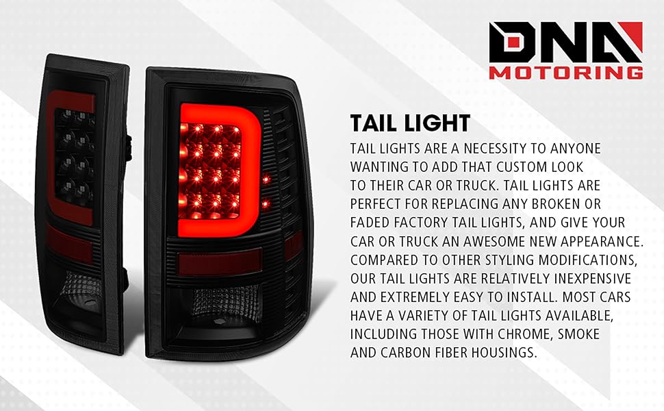 Tail lights are a necessity to anyone wanting to add that custom look to their car or truck. Tail lights are perfect for replacing any broken or faded factory tail lights, and give your car or truck an awesome new appearance. Compared to other styling modifications, our tail lights are relatively inexpensive and extremely easy to install. Most cars have a variety of tail lights available, including those with chrome, smoke and carbon fiber housings.