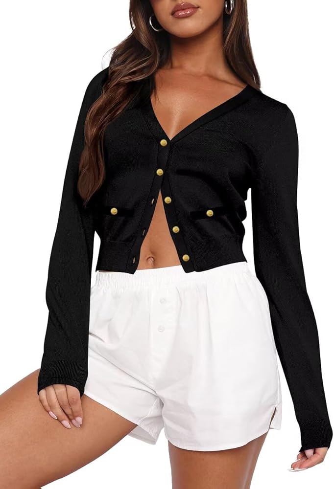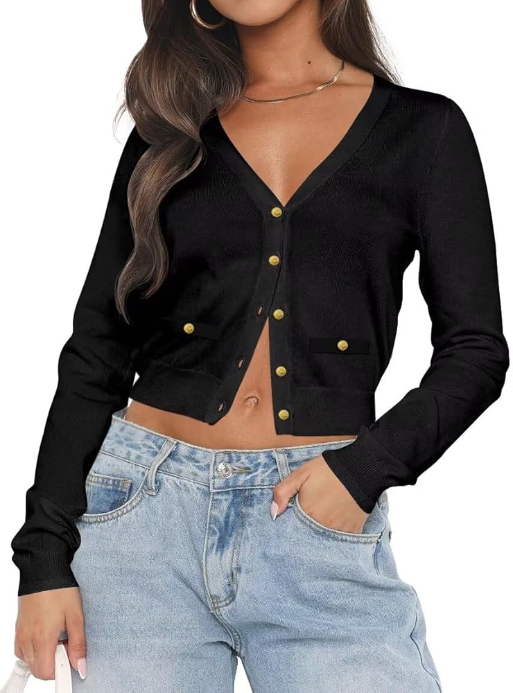 Design: Cropped sweater cardigan with button front, resin button design, the pockets are for decoration rather than function, ribbed hem and color block front, long sleeve silhouette and length above the hip for a unique style and chic look