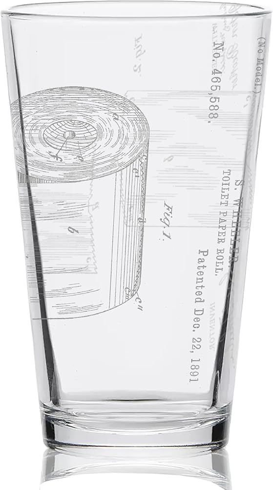 TOILET PAPER ROLL PATENT - 1891 Engraved Beer Pint Glass | Inspired by Historical Inventions Innovations & Machines | Great Collectible Gift Idea & Unique Decor!