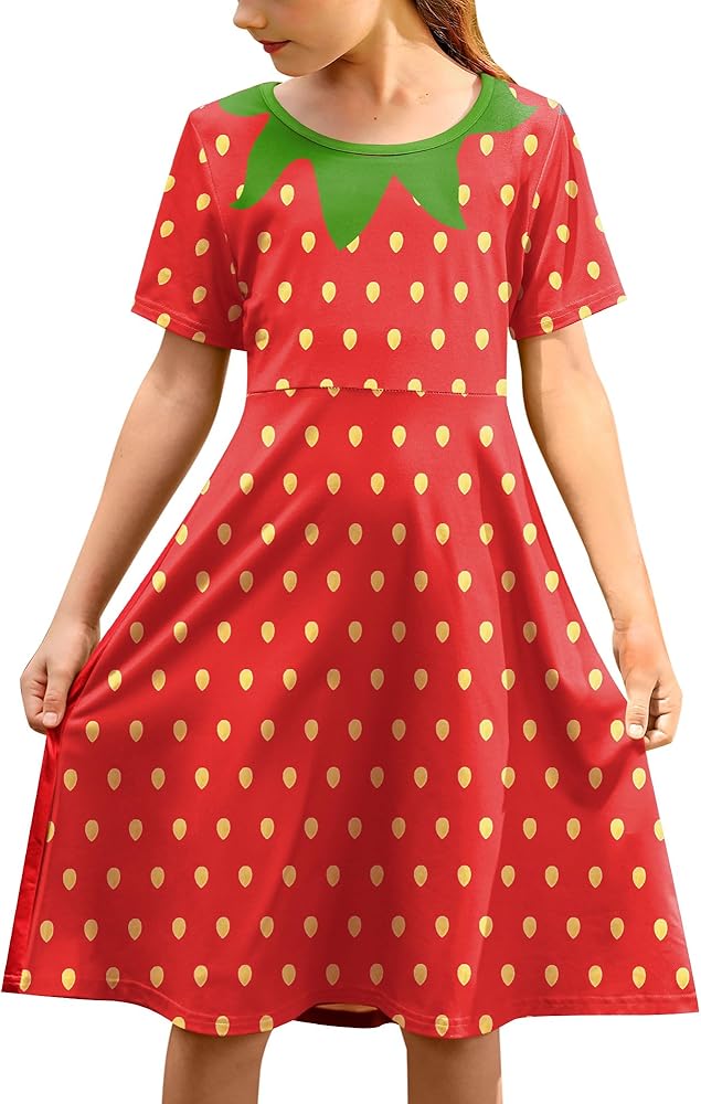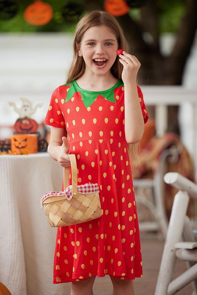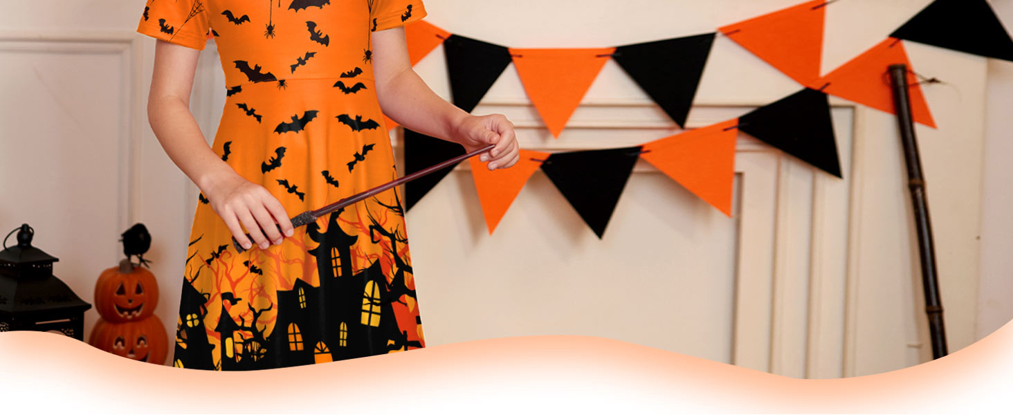 Spooky Dress – This midi dress features an all-over print with pumpkins, pumpkin faces, haunted castles, and skulls. The crewneck and short sleeves add a fun touch to your kid's Halloween look