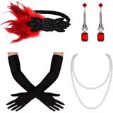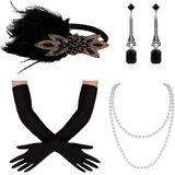 Complete 6-Piece Set: Includes 1 pc 1920s feather headband, 1 pc faux pearl necklace, 1 pair of black long satin gloves, 1 pair of geometric rhinestone earrings, offering a full vintage flapper look.