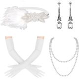 One-Size-Fits-Most Design: Elastic headband with feather and bead detailing grips hair securely, while stretchy gloves and long pearl necklace ensure comfort for most women.