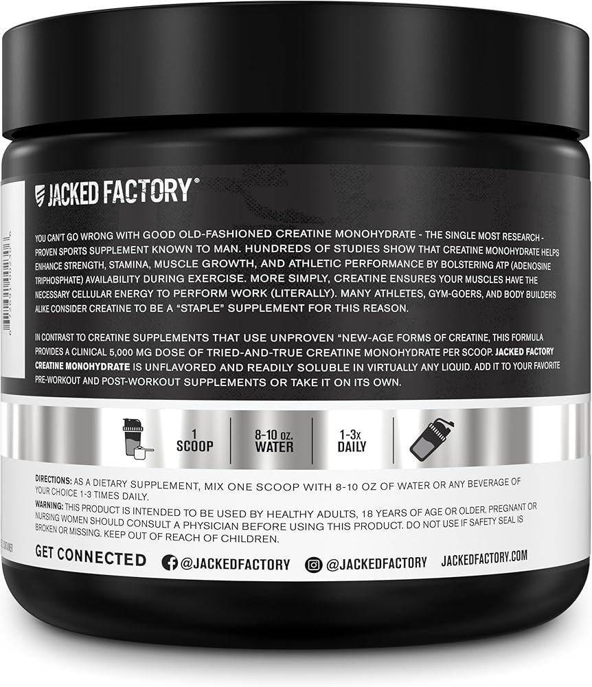 Pure Creatine Monohydrate for Performance and Recovery: Jacked Factory Creatine Stick Packs deliver 5000mg of high-quality creatine monohydrate per serving to support muscle growth, improve strength, and enhance post-workout recovery. Backed by science and trusted by athletes, this formula is designed to help you train harder and recover faster.
