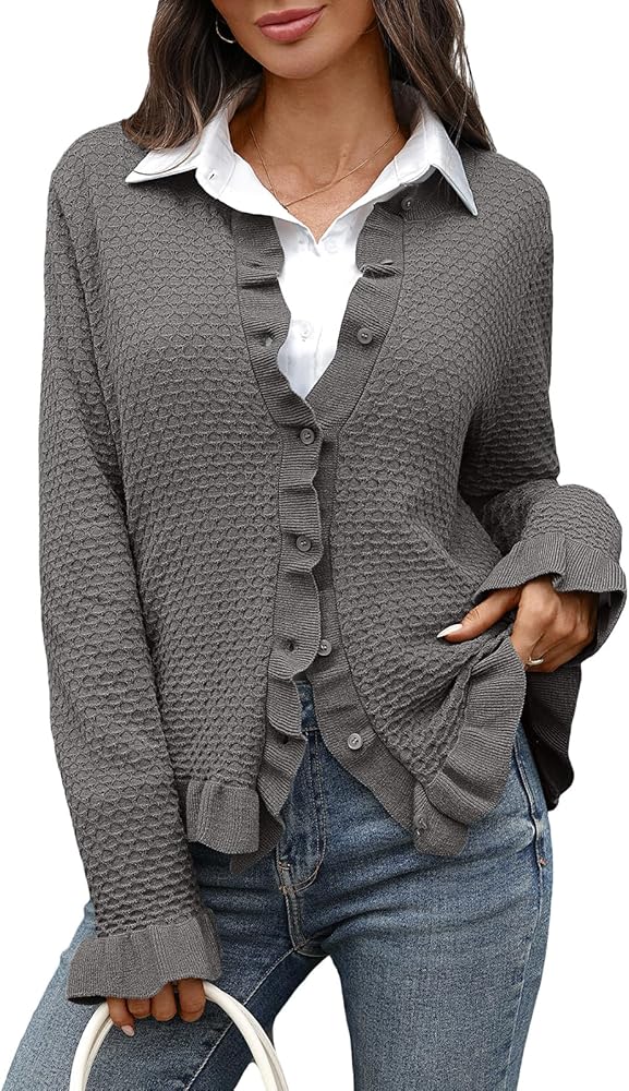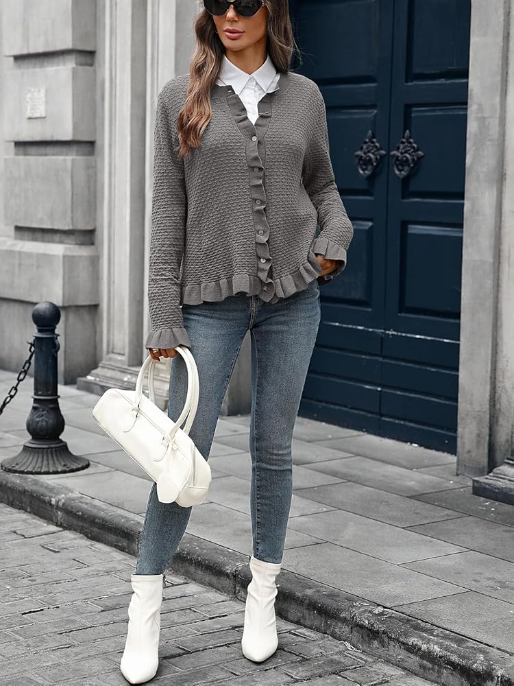 Design Highlights: This cropped cardigan comes in both button-front and open styles, featuring a round neckline, long sleeves, and ruffled cuffs and hem for an elegant, refined touch to any outfit