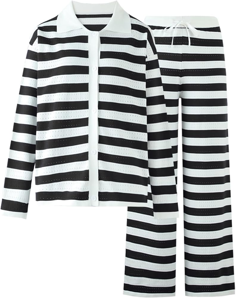 Design: Striped set, tracksuits set, 2 piece travel sets, matching sets women clothing, long sleeve polo sweater, wide leg sweatpants , drawstring pants, sweat set, button top, striped sets women 2 piece outfits, striped sweater set, matching striped set, travel outfits