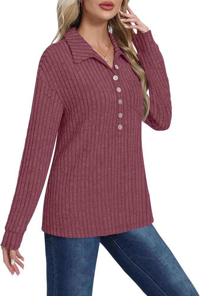 [Designs]: Invisible stripe details can help you look slimmer and show your figure better. This ribbed knit button shirt features knitting stripes, collared design and lantern sleeves, easily to dresses up or down.