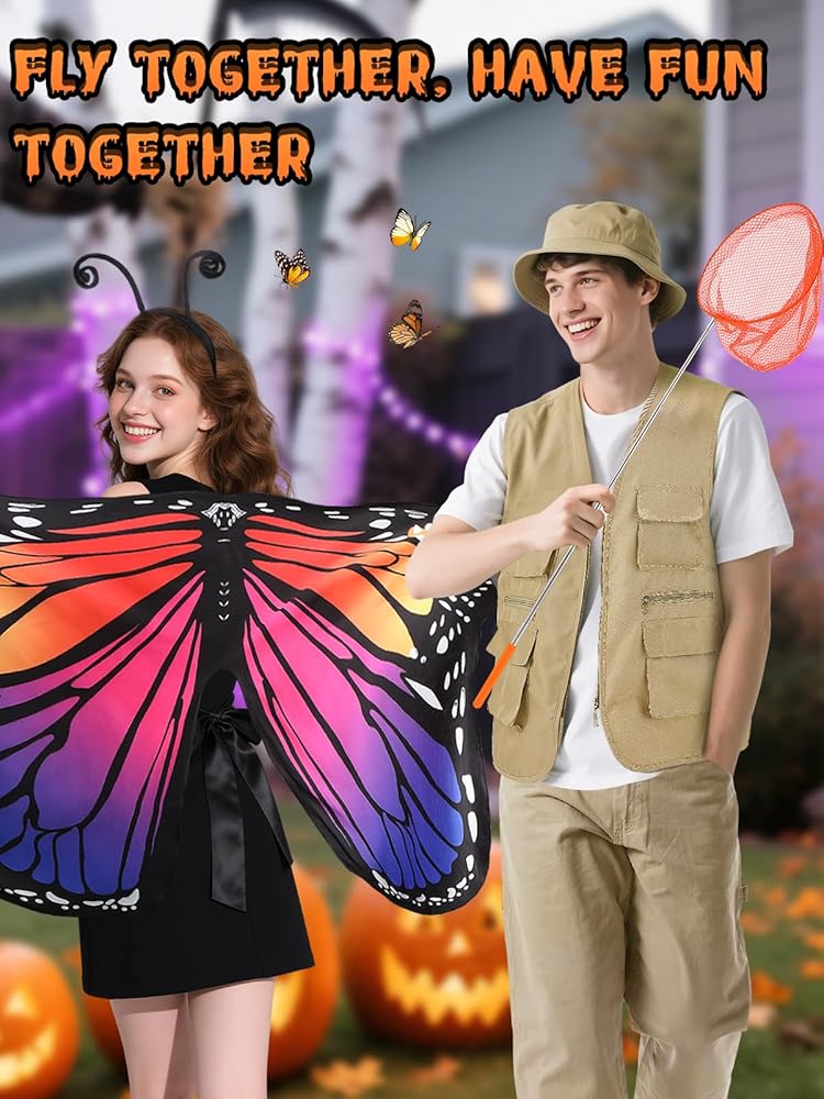 Creative Couples Look: Stand out with the unique couples halloween costumes 2025: one becomes a vivid monarch butterfly, the other a funny butterfly catcher. A fresh take on couples costumes that brings humor, interaction, and photo-worthy moments