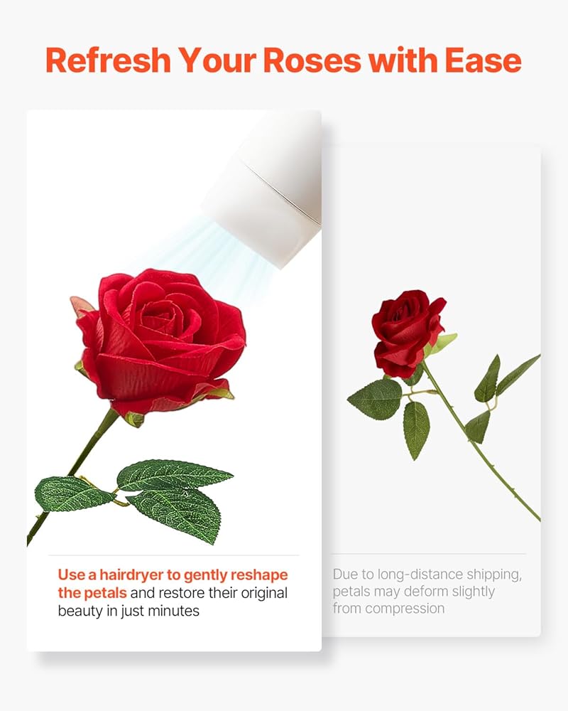 Ideal for Romantic Settings: Our fake roses are incredibly lifelike, ideal for creating warm and romantic atmospheres. Whether used alone or paired with other flowers, they will be your first choice for weddings, holidays, parties, or home decor. Let your creativity shine by designing bridal bouquets, cake decorations, or gifting a timeless bouquet to your loved ones